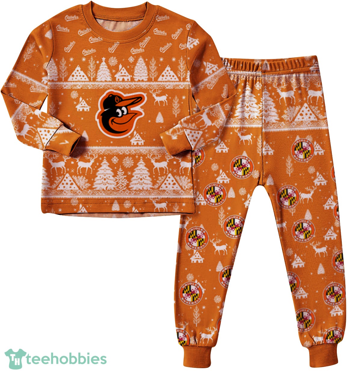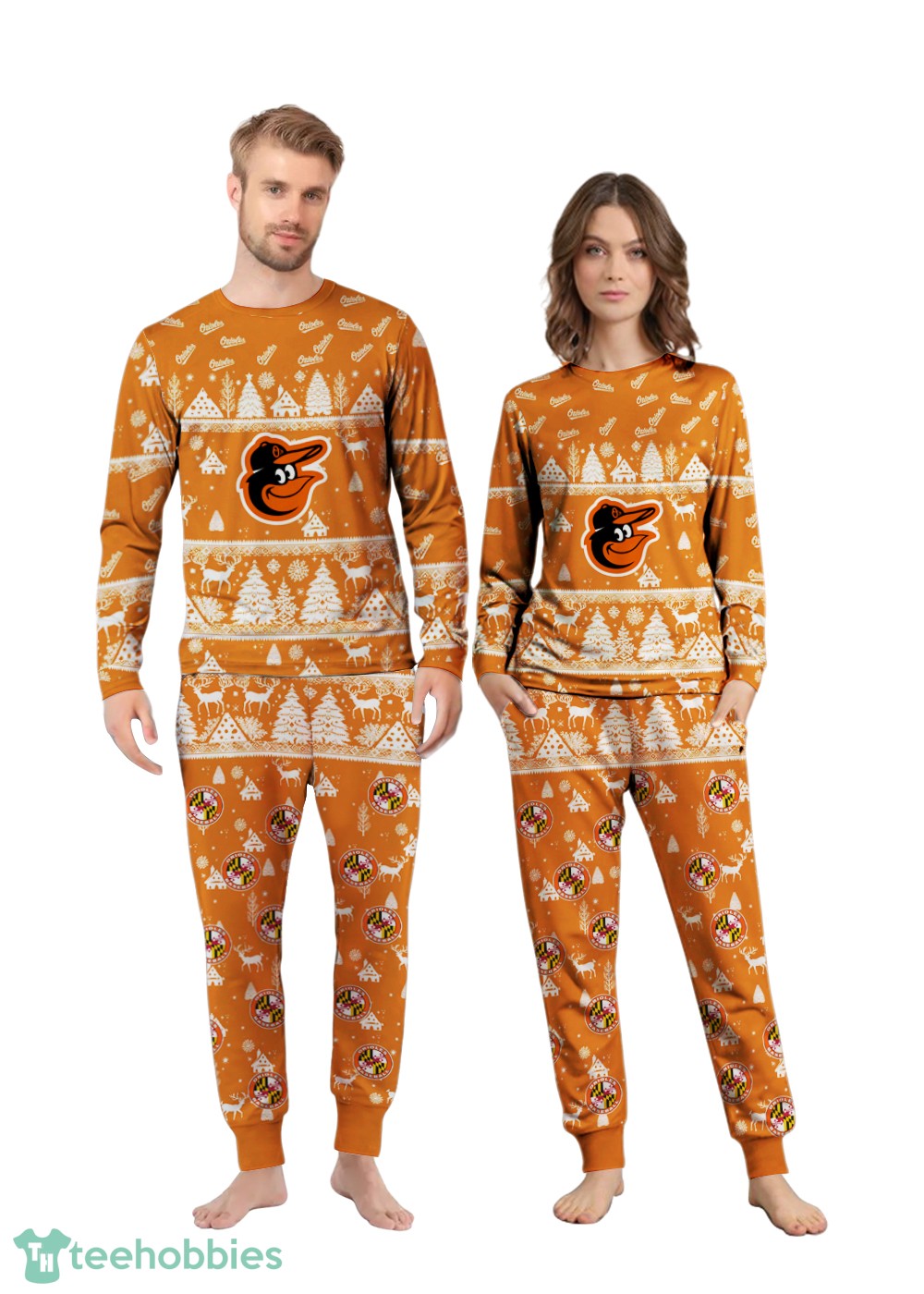 The design features a delightful Christmas pattern incorporating Baltimore Orioles team colors and logos. The design blends the holiday spirit with baseball fandom. Dominant colors are orange and black, creating a festive, yet spirited aesthetic. The pattern includes iconic Christmas elements such as snowflakes, Christmas trees, and baseballs adorned with holiday decorations. Perfect for capturing those cherished family moments under the Christmas tree, these pajamas embody both comfort and holiday cheer.
