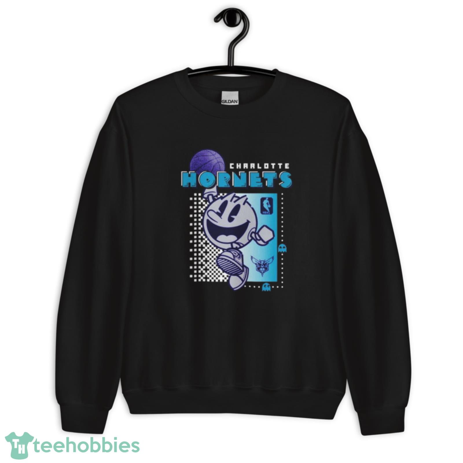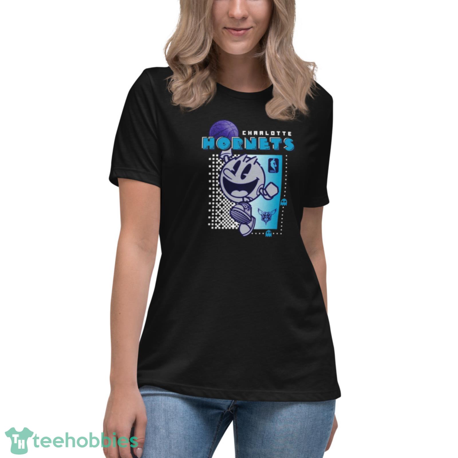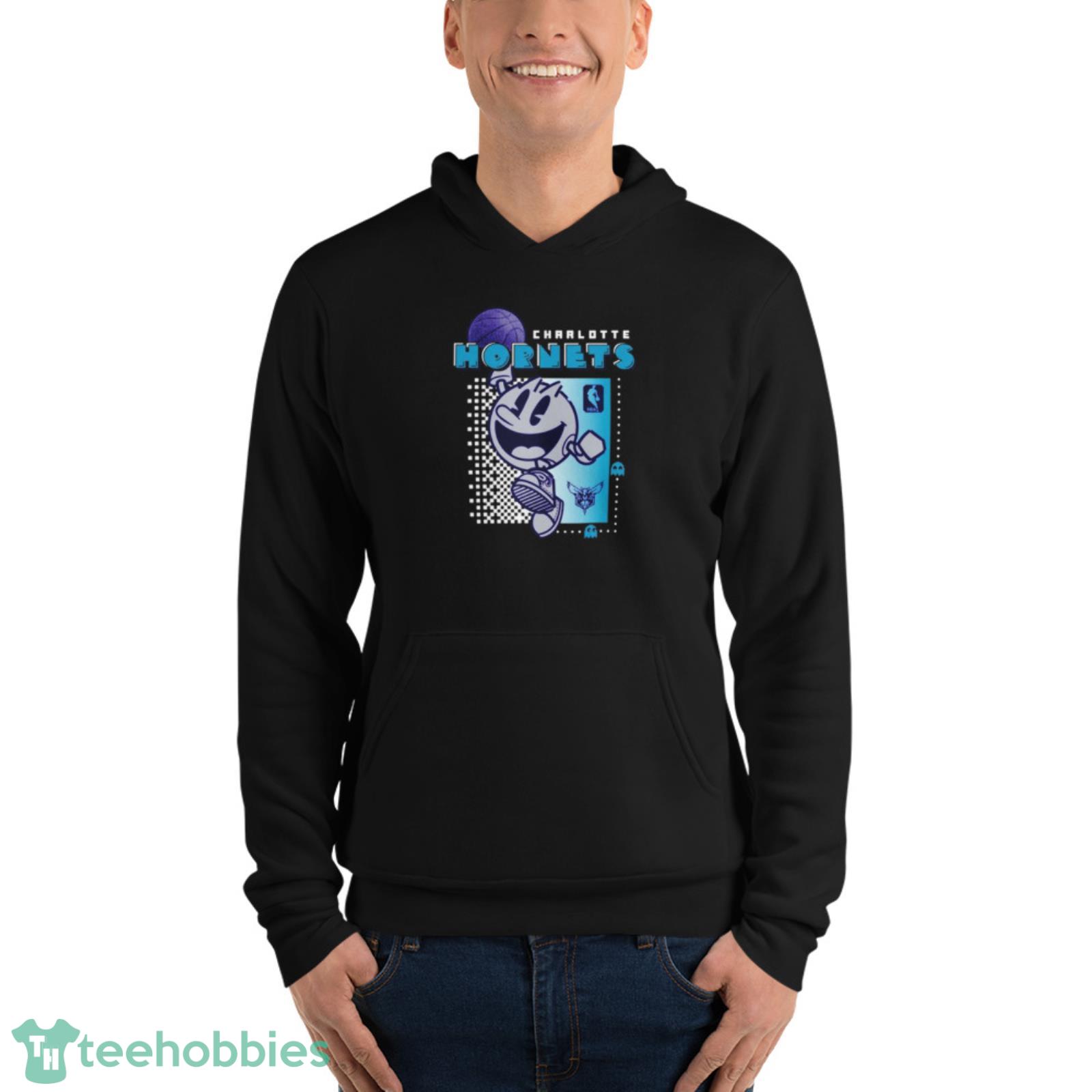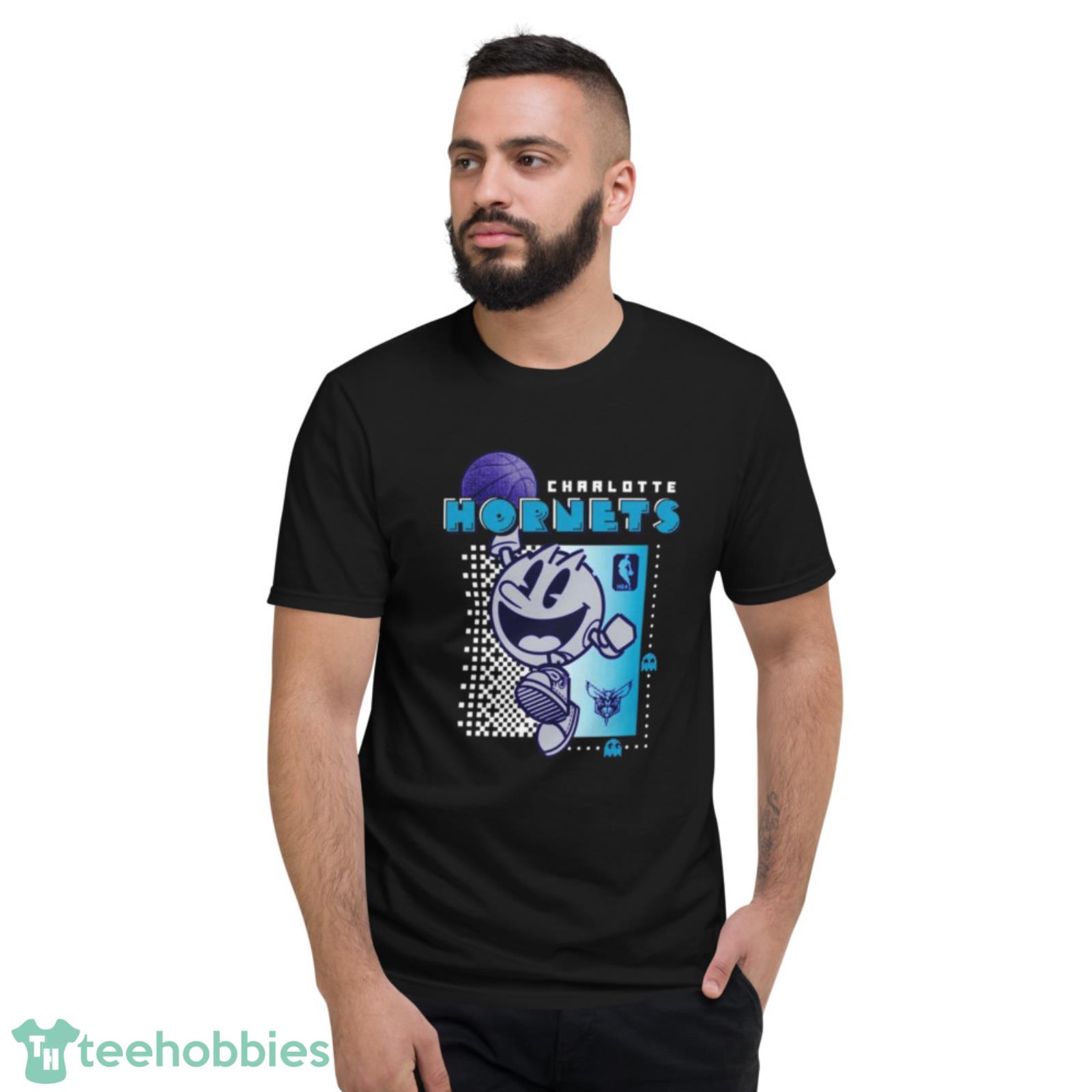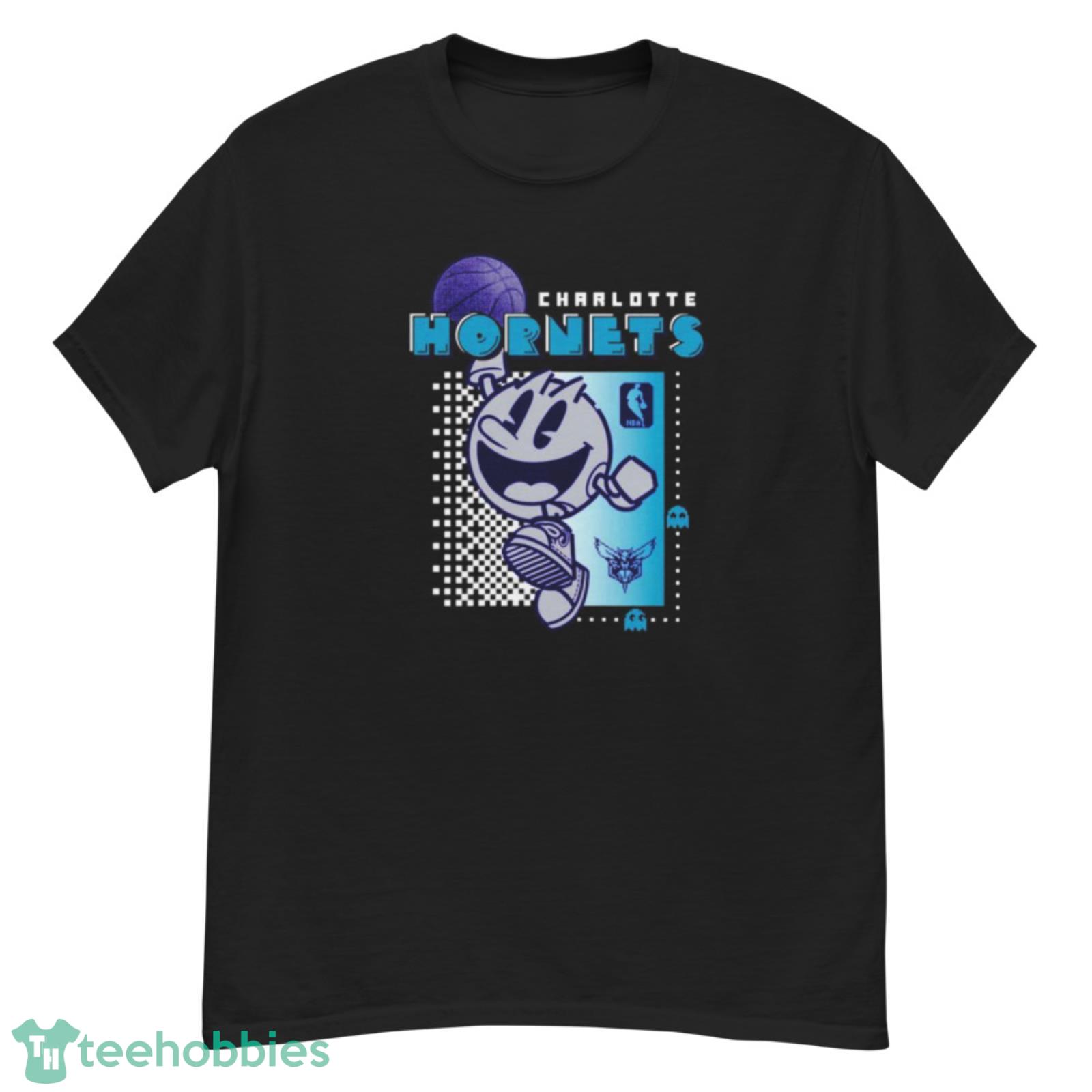 Crafted from high-quality materials, this shirt is built to last and will keep you comfortable all day long. The bright and colorful design features the iconic Charlotte Hornets logo, as well as the classic Pac Man design, making it the perfect way to show off your love for both the team and the classic arcade game.