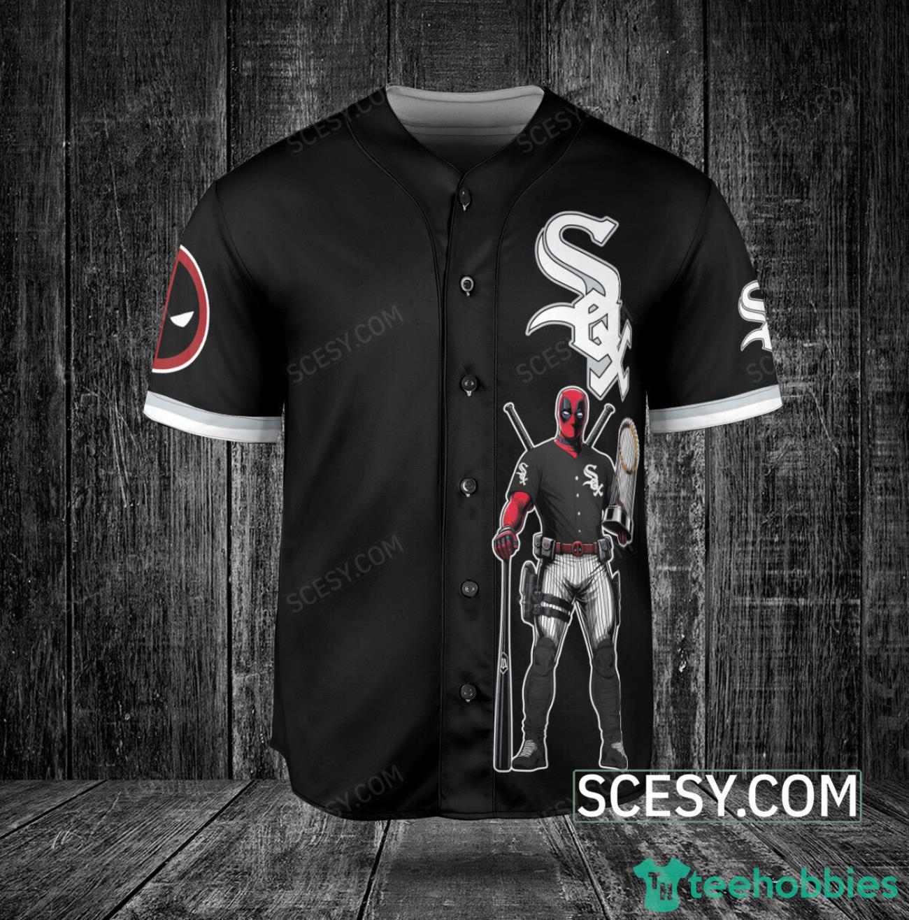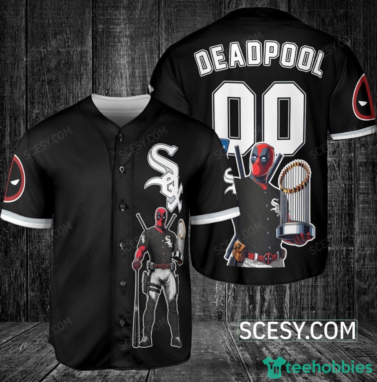Get ready to show off your love for both the Chicago White Sox and Deadpool with this awesome baseball jersey in sleek black. This officially licensed jersey features the iconic White Sox logo on the front and Deadpool’s signature symbol on the back, making it a must-have for any fan. Made with high-quality materials, this jersey is not only stylish but also comfortable to wear to the game or out with friends. Stand out from the crowd and let your fandom shine with the Chicago White Sox Deadpool Baseball Jersey Black.