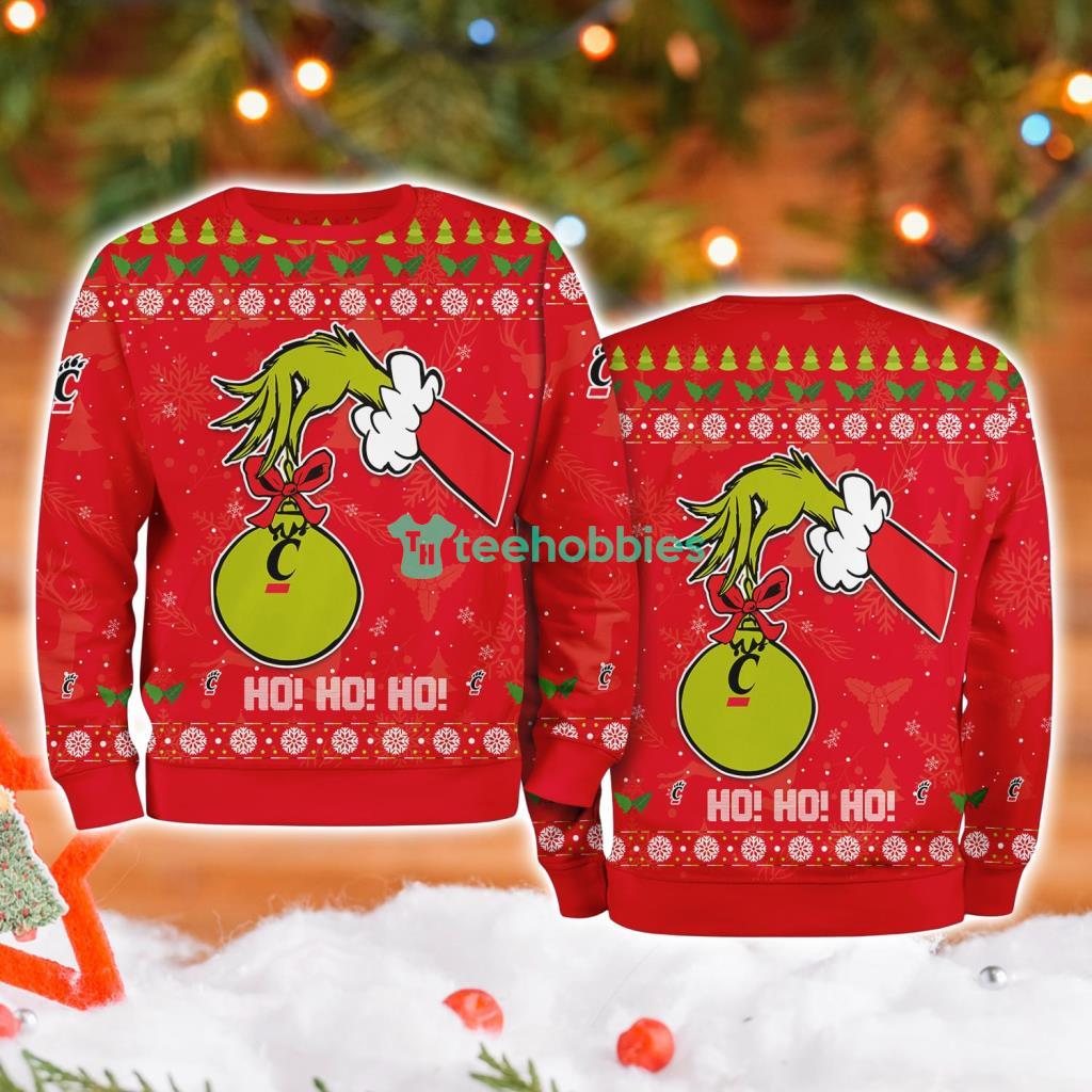 The sweater showcases a bold and festive design, incorporating the iconic Grinch hand reaching for a Cincinnati Miami NCAA emblem. The contrasting colors of the team logo and the Grinch’s signature green create a visually striking effect. The composition balances the playful Grinch theme with the pride of supporting your favorite college team, making it the ultimate conversation starter at any ugly Christmas sweater party.