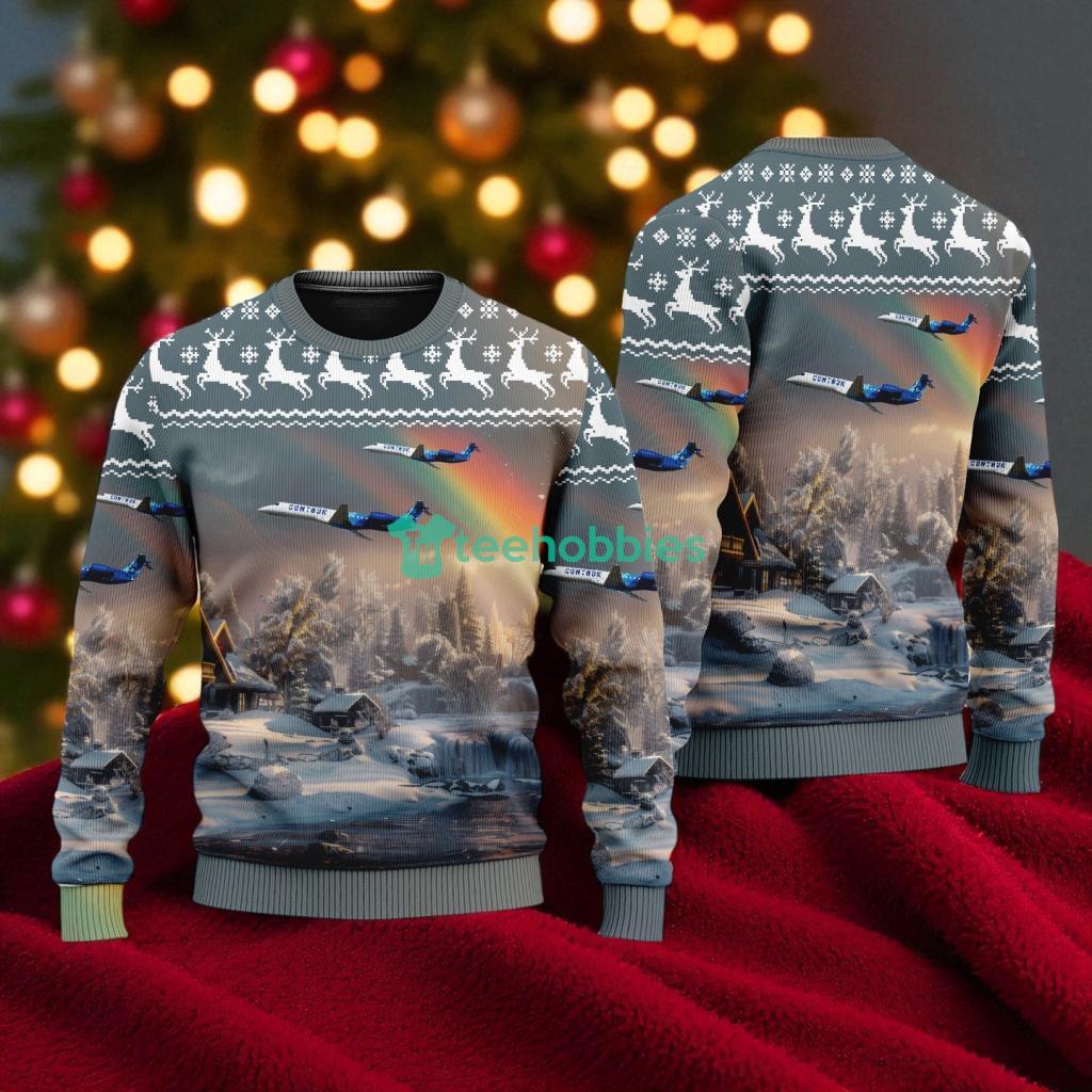Inspired by the festive season, this sweater boasts a charming design featuring a cozy Christmas house nestled beneath a vibrant rainbow. The artwork cleverly incorporates elements reminiscent of the Contour Airlines Embraer ERJ-145LR and the American Airlines brand, creating a unique fusion of aviation and holiday spirit. The overall composition is balanced, ensuring the design remains eye-catching without being overwhelming. The colors are bright and cheerful, perfectly capturing the joyous essence of Christmas.