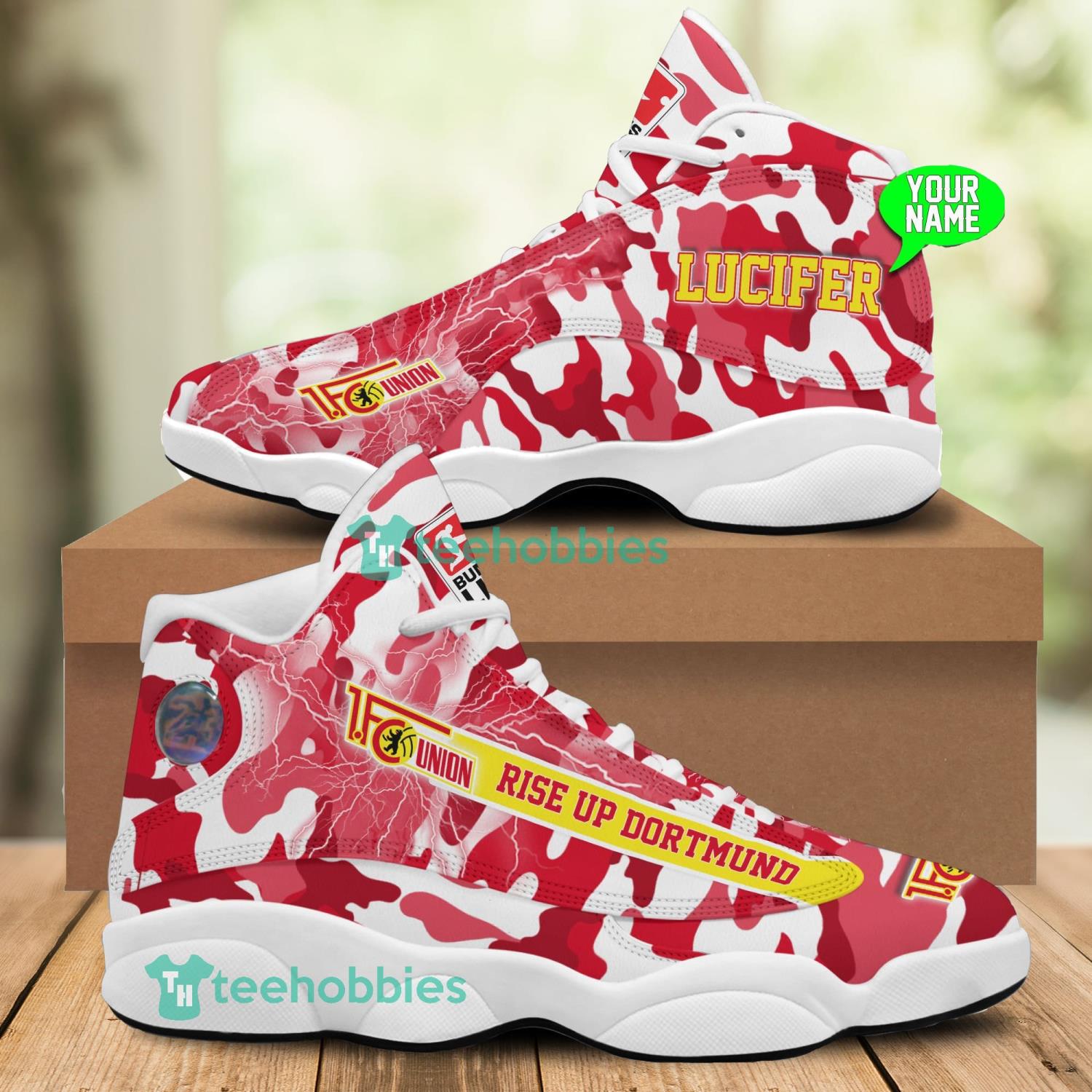 Some of the Custom Name 1. FC Union Berlin Bundesliga Camo White Air Jordan 13 Shoes Sneaker For Fan Gift photos