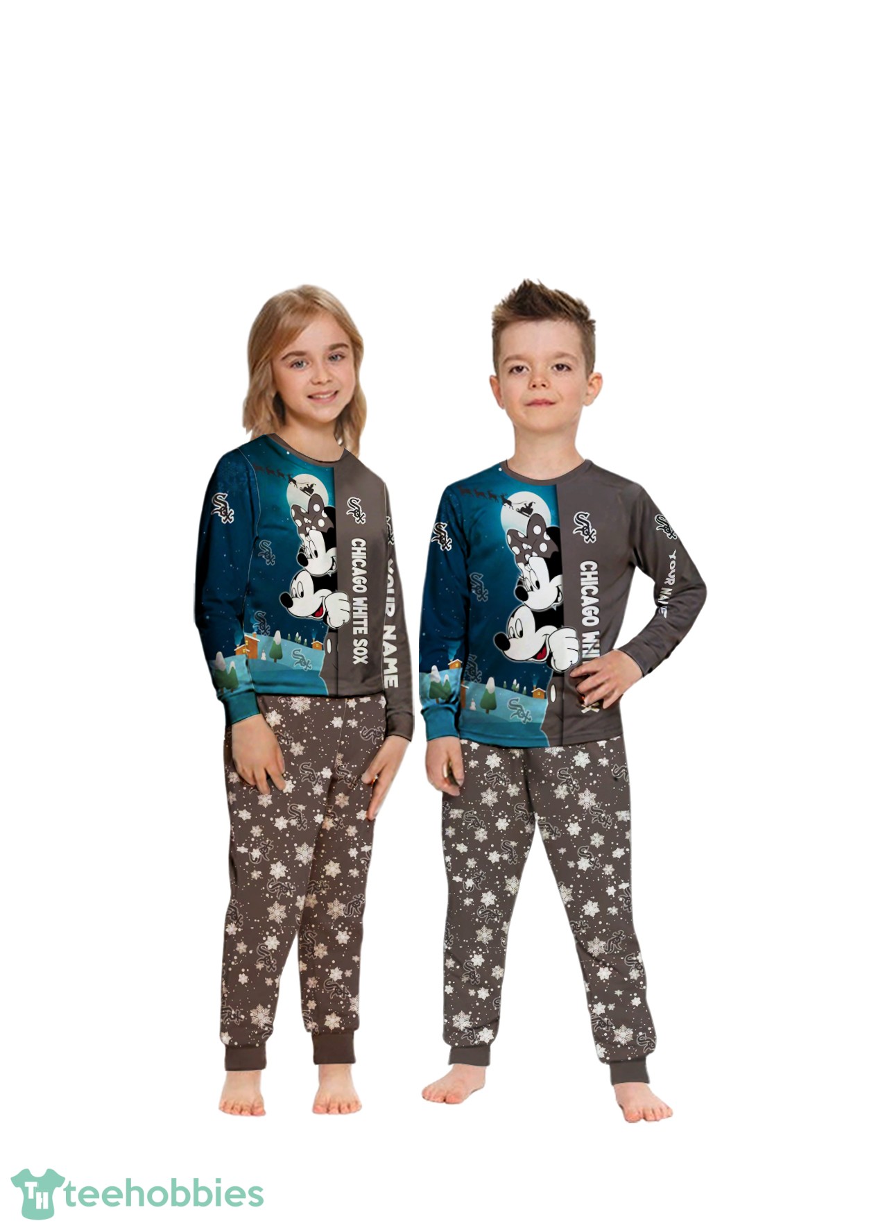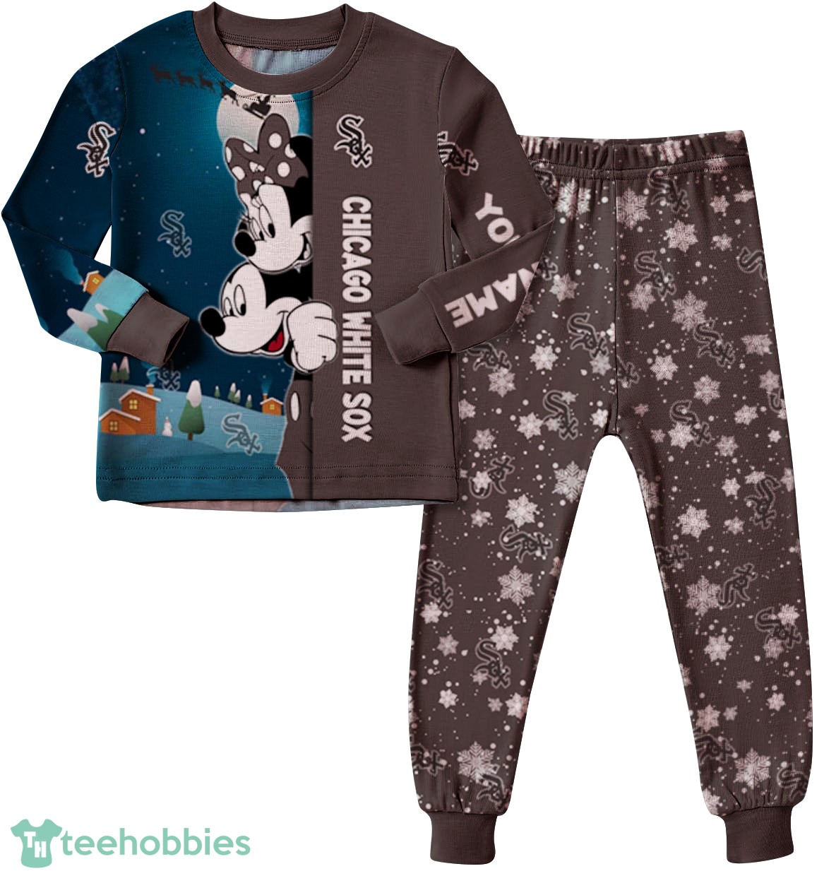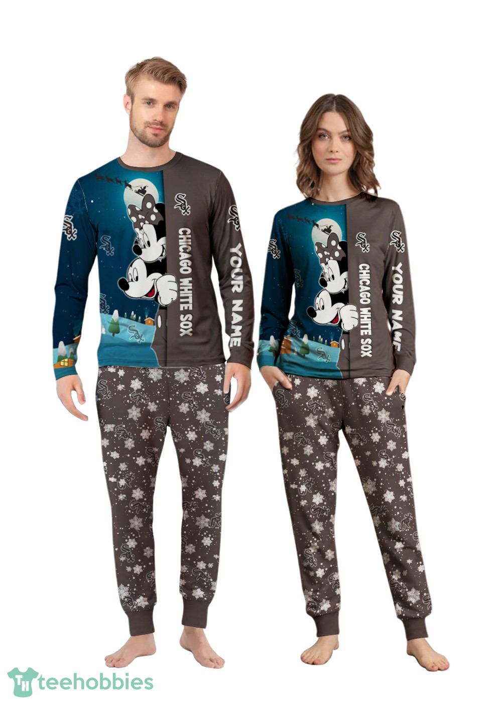 The design features a charming cartoon mouse couple decked out in Chicago White Sox gear, adding a playful and sporty twist to your Christmas sleepwear. The vibrant colors and delightful cartoon style create a festive and joyful look, perfect for capturing those precious holiday moments.