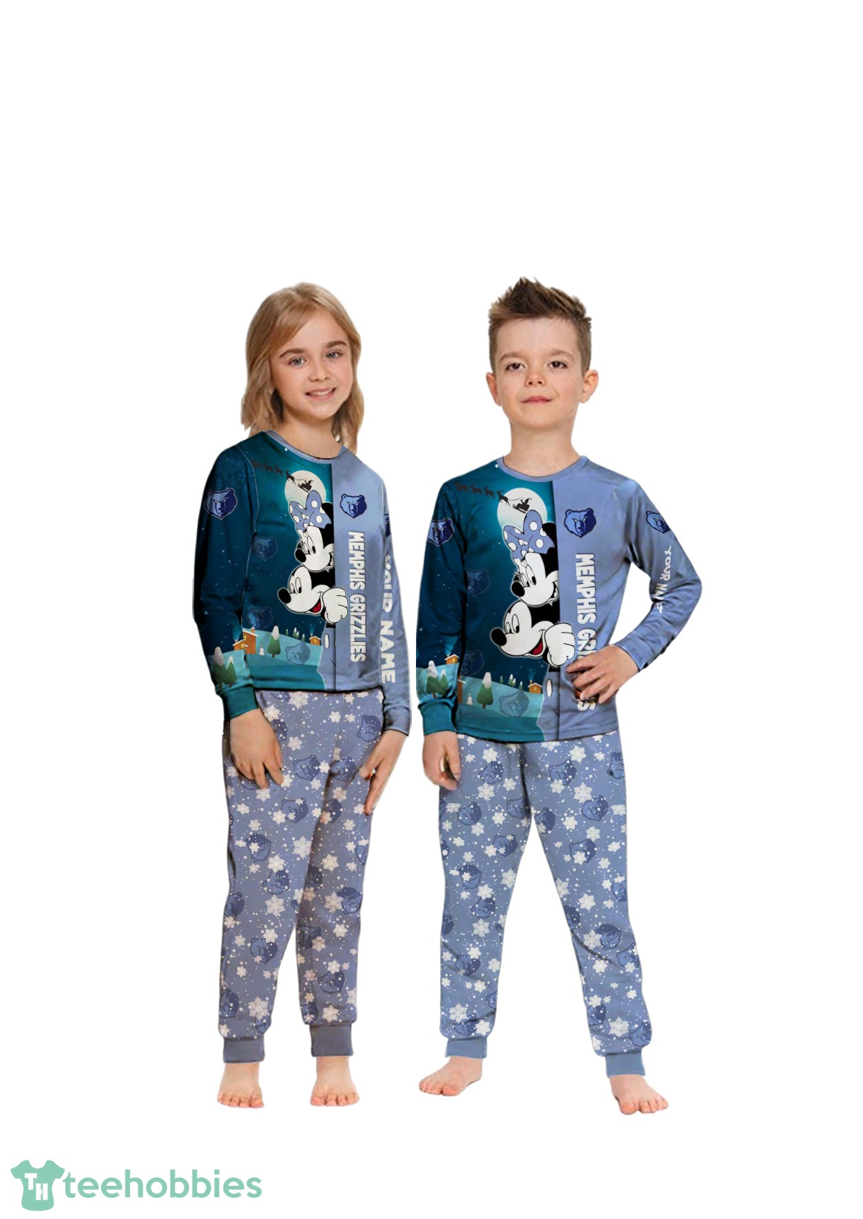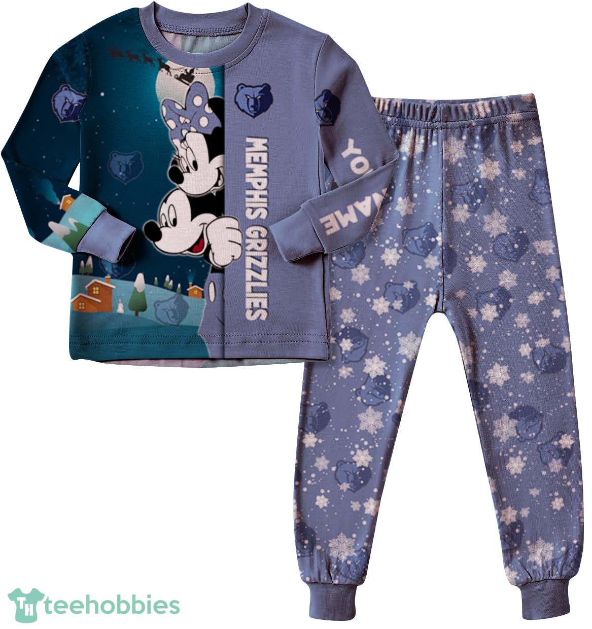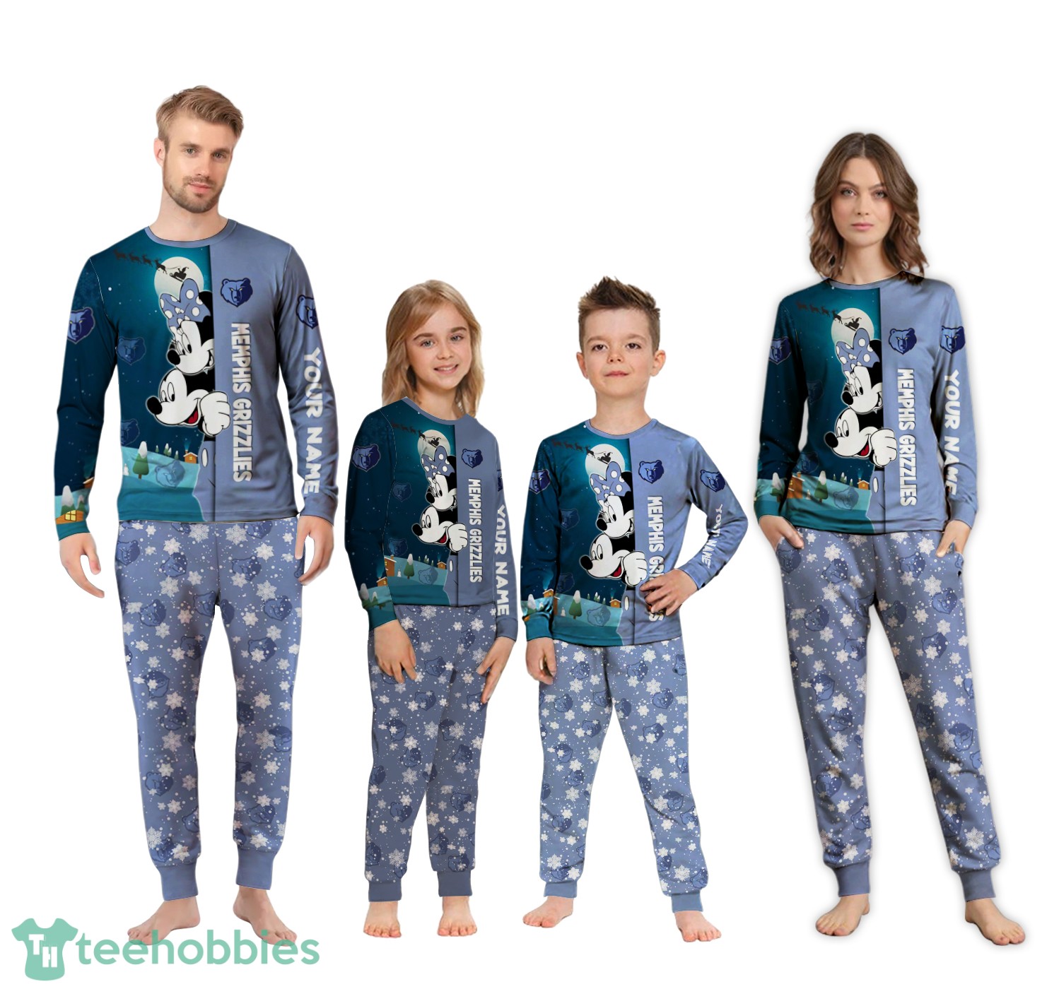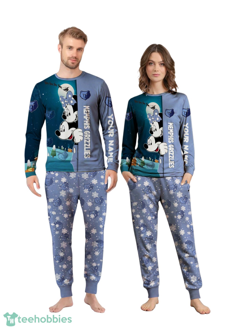 The Christmas pajamas feature an all-over print with a charming cartoon mouse couple dressed in Memphis Grizzlies attire, adding a playful and festive touch. The design uses vibrant colors, primarily shades of blue, white, and grey, reflecting the Grizzlies’ team colors, interwoven with holiday accents. The composition is thoughtfully arranged to showcase the cartoon characters and team logo, ensuring a visually appealing and spirited design. The ability to add custom names enhances the personal touch, making these pajamas a cherished keepsake.