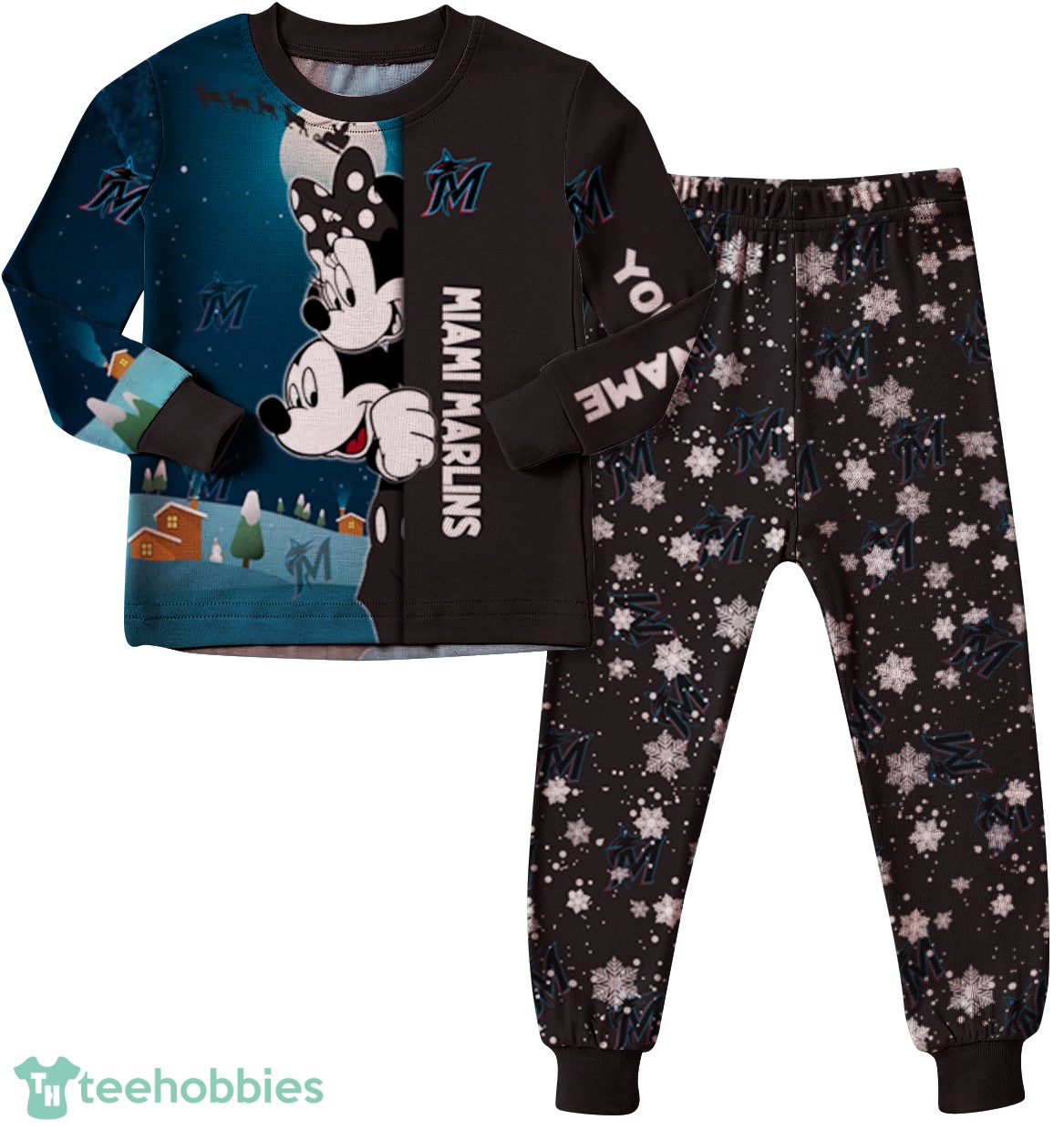 - Festive Miami Marlins Theme: Featuring a charming cartoon mouse couple decked out in Christmas attire and Miami Marlins gear, these MLB pajamas perfectly capture the holiday spirit and baseball fandom.
