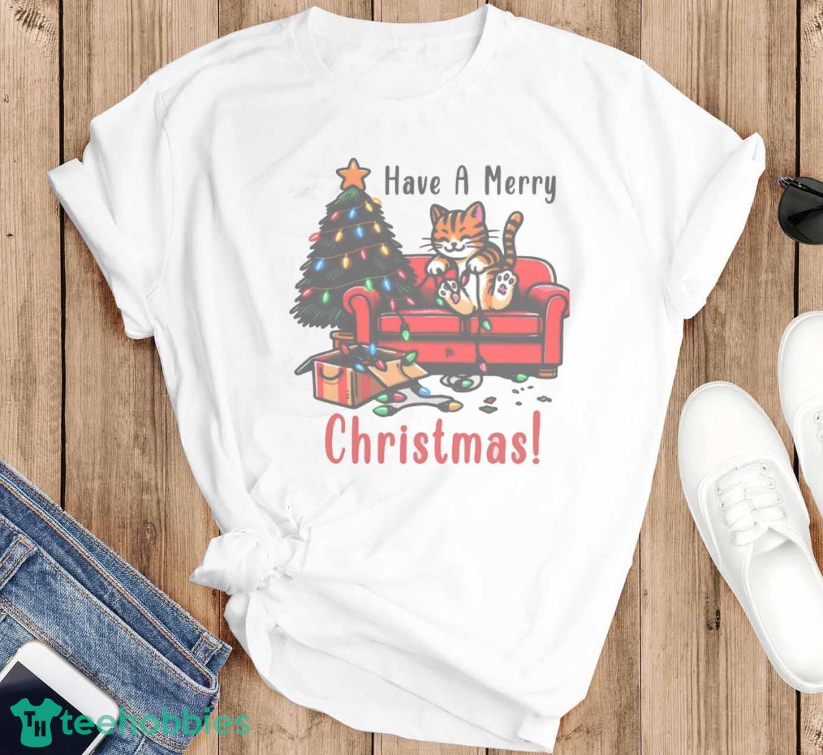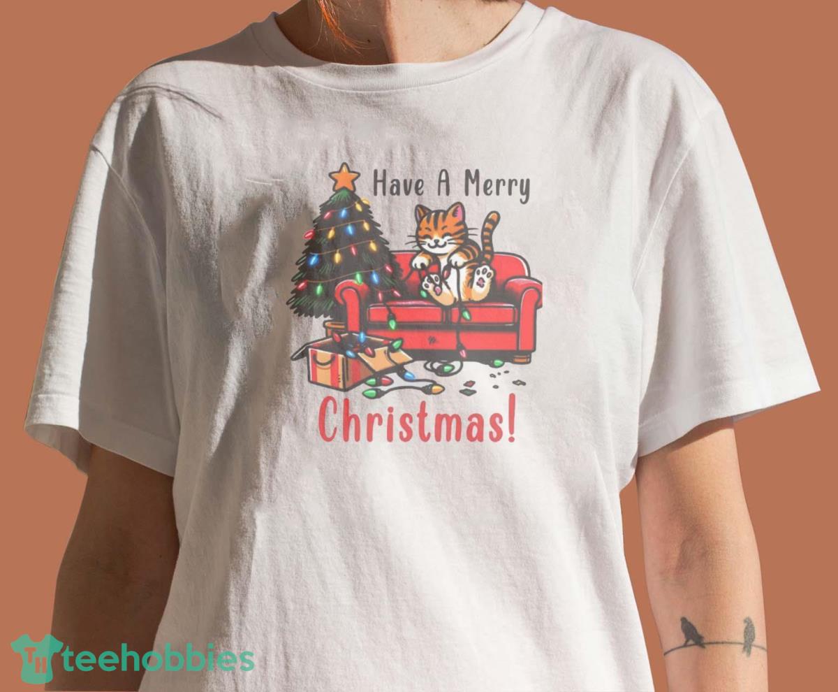 The design features a whimsical illustration of a cute cat adorned with Christmas decorations, creating a heartwarming and playful aesthetic. The color palette is classic Christmas – think vibrant reds, greens, and whites – bringing a touch of joy to your wardrobe. The composition is balanced, with the cat positioned centrally, making it a focal point and ensuring the design is visually appealing whether you choose the holiday t-shirt, cozy sweatshirt, or warm hoodie.