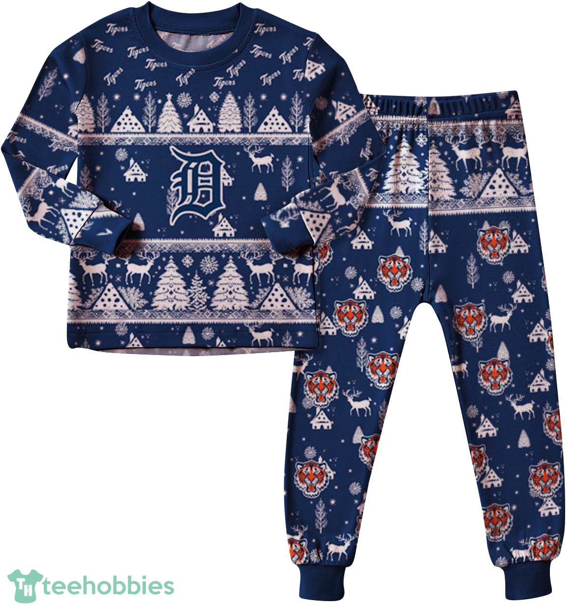 The design showcases a delightful Christmas pattern incorporating Tigers pajamas themes. The color palette revolves around the classic MLB apparel team colors, interwoven with festive reds, greens, and whites, creating a balanced and visually appealing holiday theme. The all-over print features iconic Detroit Tigers logos alongside holiday motifs like snowflakes and Christmas trees, perfectly blending team spirit with holiday cheer.