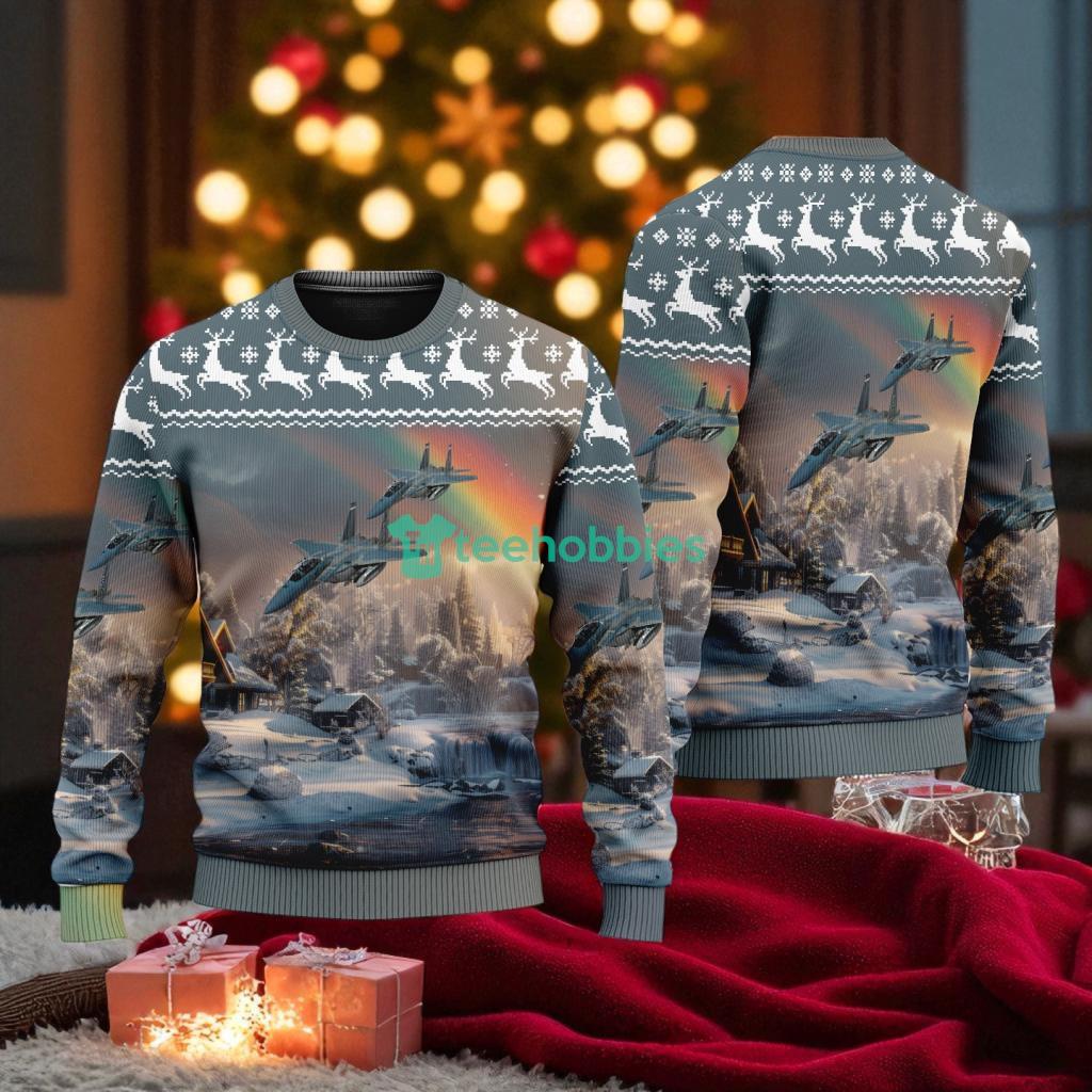 The design showcases the formidable F-15EX Eagle II military aircraft soaring above a quaint Christmas house scene. A vibrant rainbow arcs across the design, adding a touch of whimsy and symbolizing hope and joy. The color palette features a mix of traditional Christmas colors like red, green, and white, contrasted with the realistic greys and blues of the aircraft. This creates a visually appealing and memorable holiday apparel item. It’s an airline sweater that transcends the ordinary, making it a must-have for aviation enthusiasts and holiday revelers alike. This ugly Christmas sweater with airplane will be the talk of your next party!