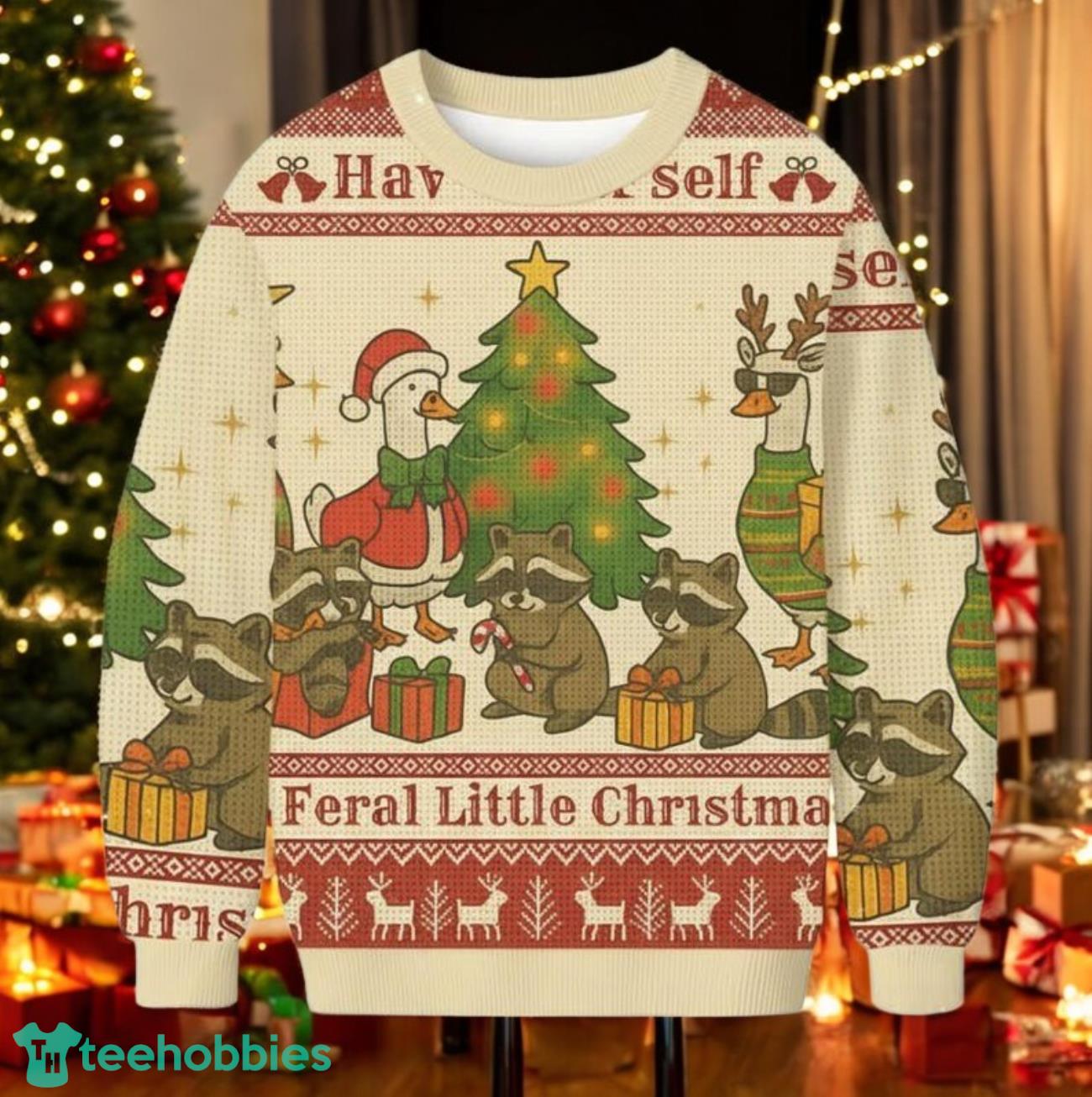 The sweater features a vibrant and whimsical design showcasing a collection of wild animals in a festive, “ugly sweater” style. The composition is balanced, creating a fun and engaging visual experience. The overall theme suggests a lighthearted and joyful celebration of the holiday season with a touch of the unexpected.