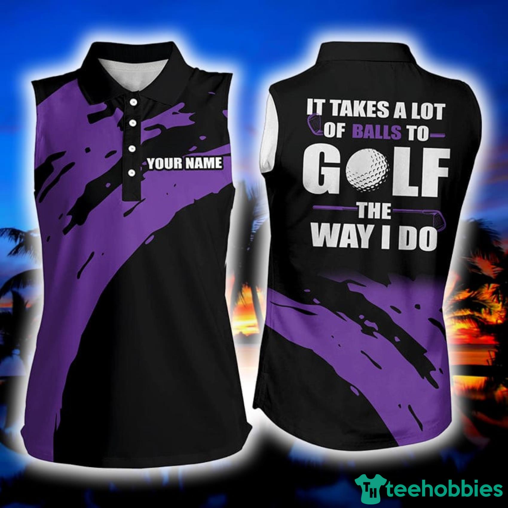 Funny Black Custom Name It Takes A Lot Of Balls To Golf The Way I Do Purple Women’s Sleeveless Polo Shirt Information: