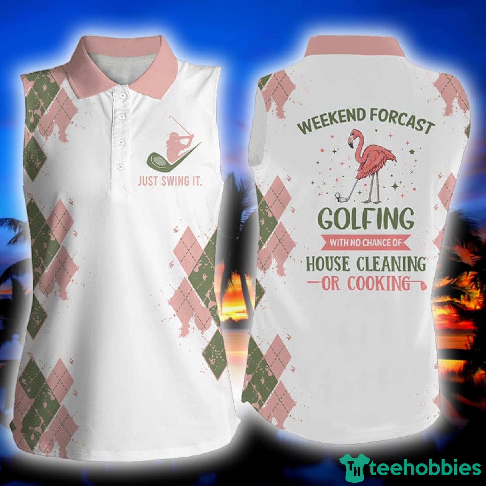 Some of the Funny FlamingoWeekend Forecast Golfing With No Chance Cleaning Cooking Women’s Sleeveless Polo Shirt photos