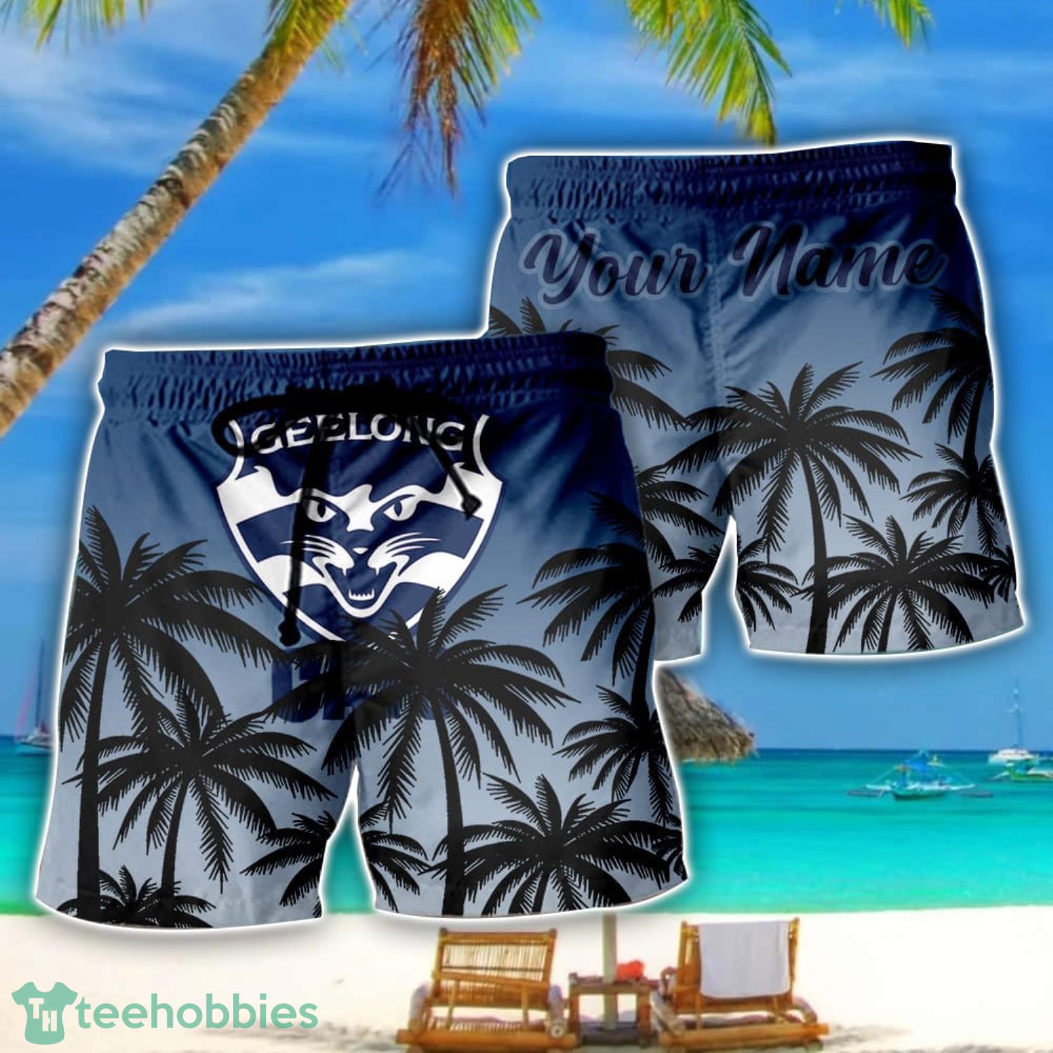 Some of the Geelong Cats AFL Coconut Pattern Tropical Beach Shorts For Mens Personalized Name photos