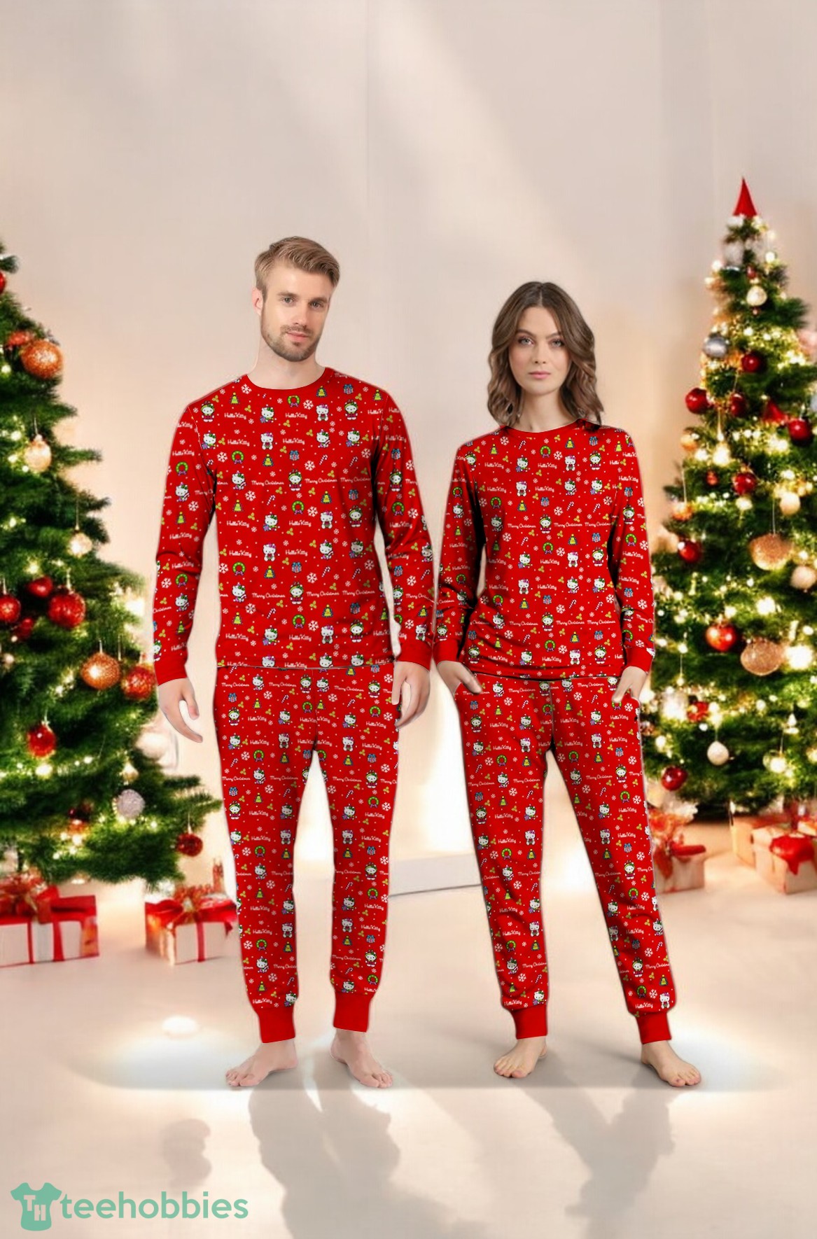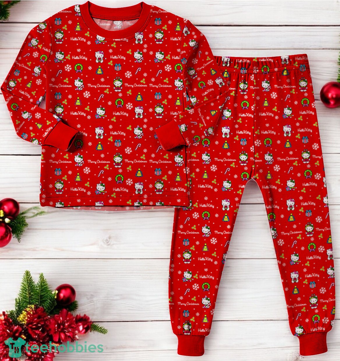 The design features an all-over print of a festive Hello Kitty pattern against a bright red backdrop. The composition creates a cheerful and playful aesthetic, perfectly capturing the spirit of Christmas. The harmonious blend of colors and the iconic Hello Kitty character make these pajamas a visual delight for the whole family. These family Christmas PJs are going to look stunning in pictures and videos!