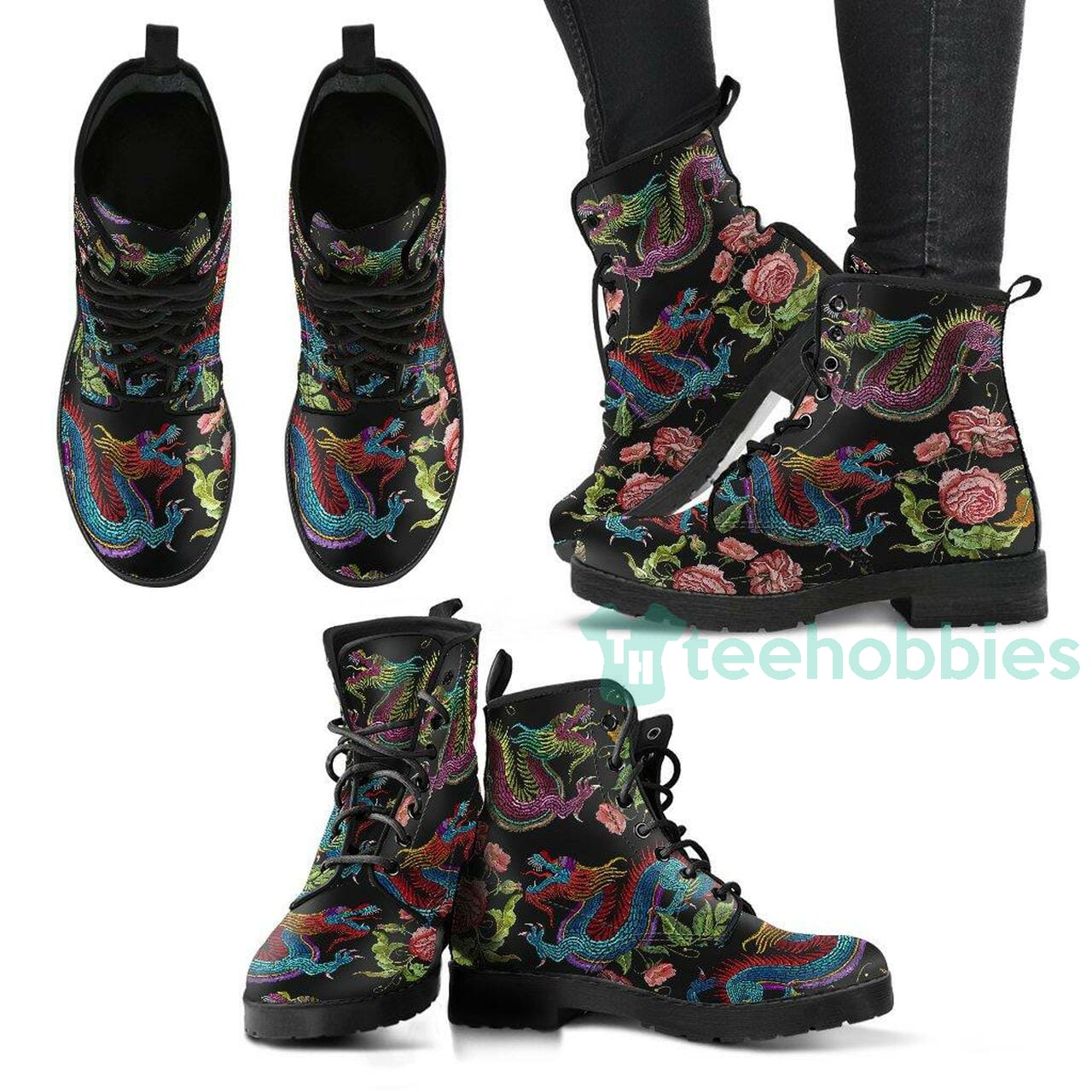 Handcrafted Dragons And Flowers Leather Boots Shoes. Boots are the ultimate walking shoes for the modern man and woman. Whether you’re hitting the trails, walking the dog, or just running errands around town, Boots can do it all in style and comfort. They’ll keep your feet dry with their waterproof construction, and they’ll never fail to look good with their quality leather construction and sleek design. With these boots on your feet, you’ll never have to worry about being fashionable and feeling good wherever you go!