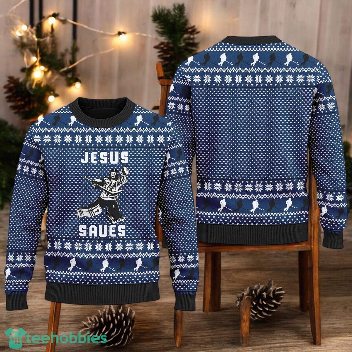 Hockey Jesus Saves Ugly Christmas Sweater Hockey Team Christmas Xmas Holiday Sweater