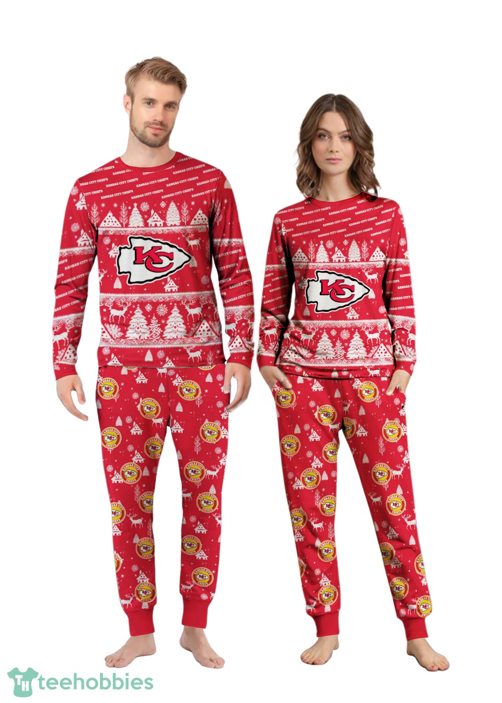 - All-Over Print Design: Features a long-sleeve t-shirt and long pants with an all-over print design, showcasing the festive Kansas City Chiefs Christmas pattern.
