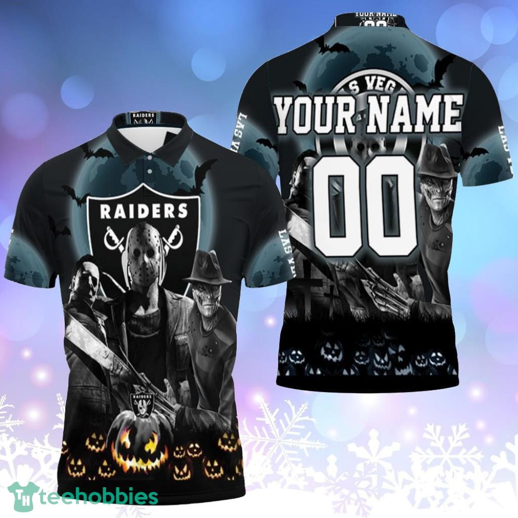 Crafted with the highest quality materials, this polo shirt features a unique 3D design that brings the Raiders logo to life in a terrifying way. The black and silver color scheme is perfect for Halloween, and the personalized touch makes this shirt truly your own.