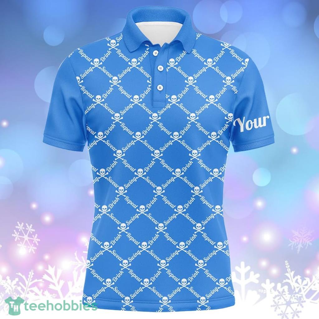 Mens Golf Polo Shirt Swing Swear Drink Repeat Golf Skull Custom Name Golf Wear For Mens Blue Product Photo 1