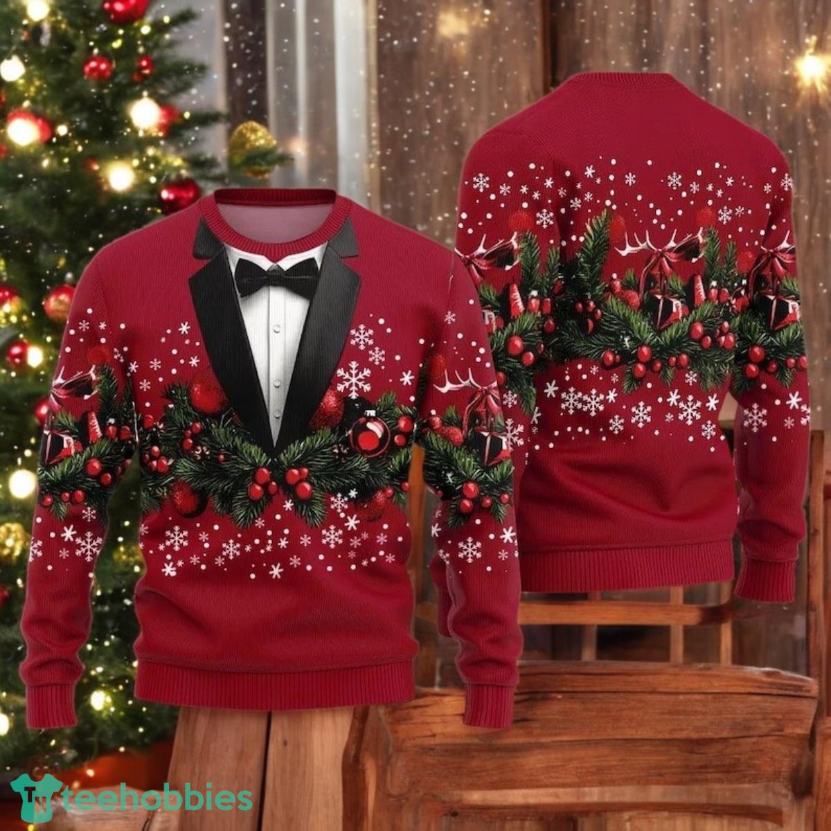 This design features a bold red suit print complete with a bow tie, creating a hilarious optical illusion. The composition cleverly mimics a formal tuxedo jacket over a sweater, blending sophistication with lightheartedness. The overall effect is a whimsical yet stylish piece of Christmas apparel that’s sure to bring joy and laughter.