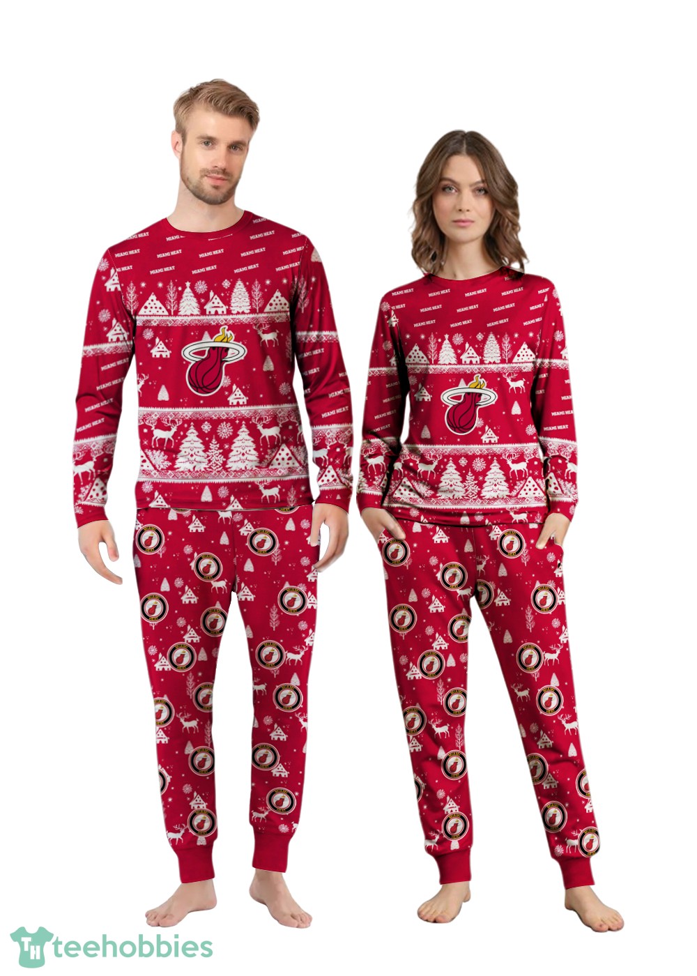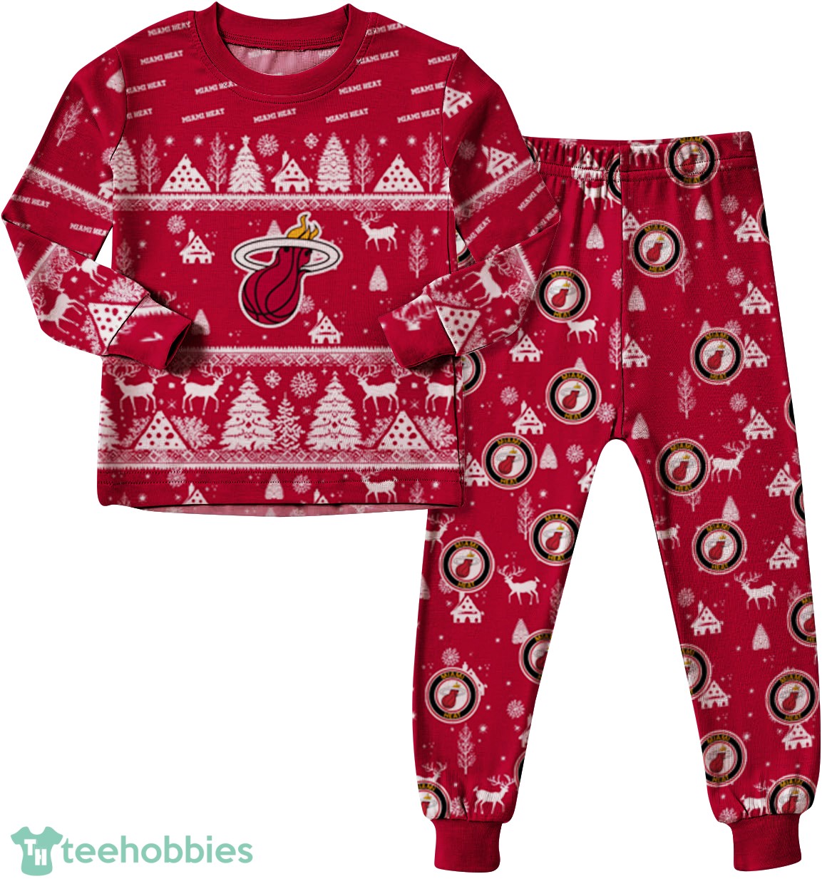 The design features a vibrant and playful Christmas pattern incorporating Miami Heat team colors (red, black, and white). The pattern likely includes Heat logos, basketballs, snowflakes, and other holiday-themed elements for a fun and festive look. The composition is likely an all-over print ensuring that every part of the pajamas is filled with holiday cheer and team pride.