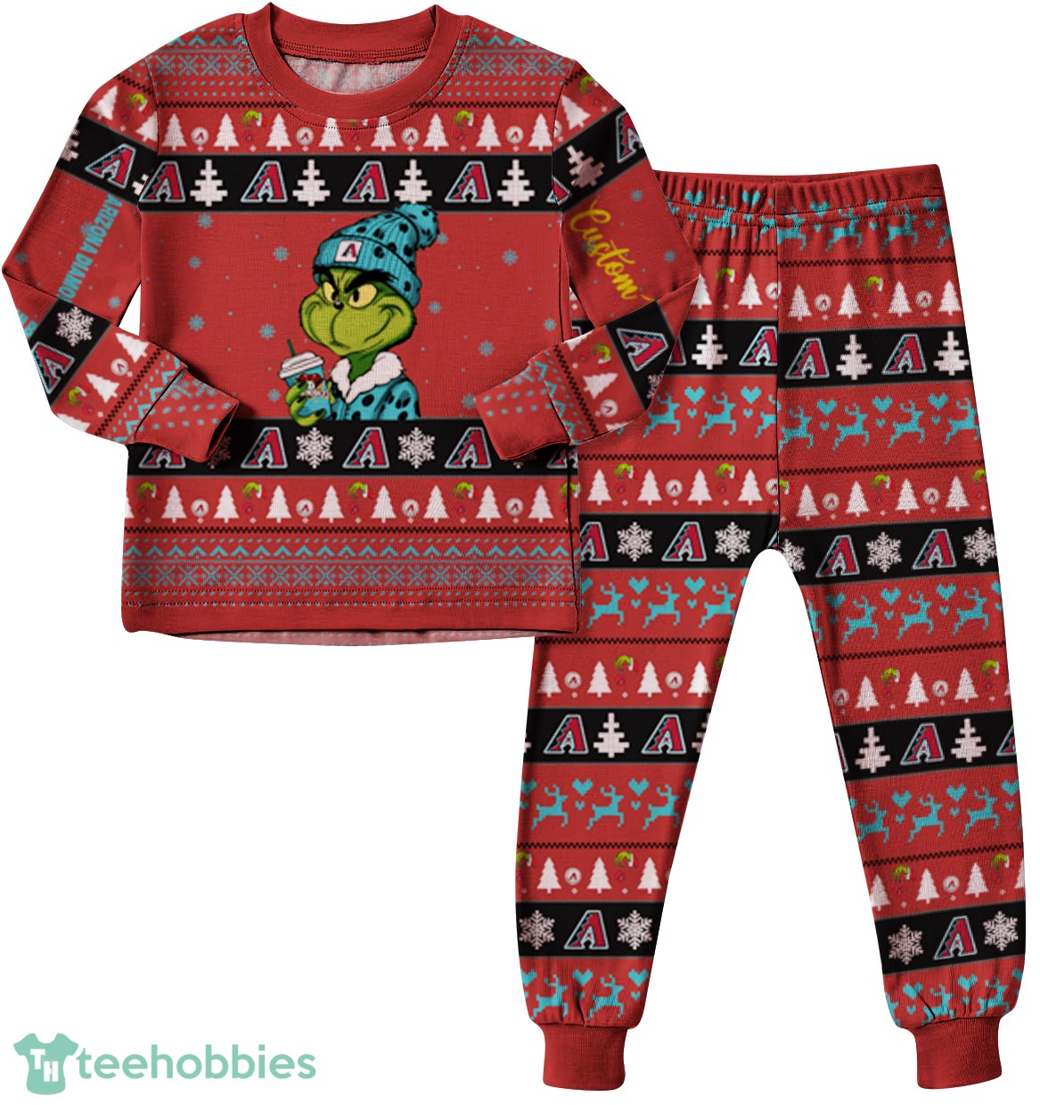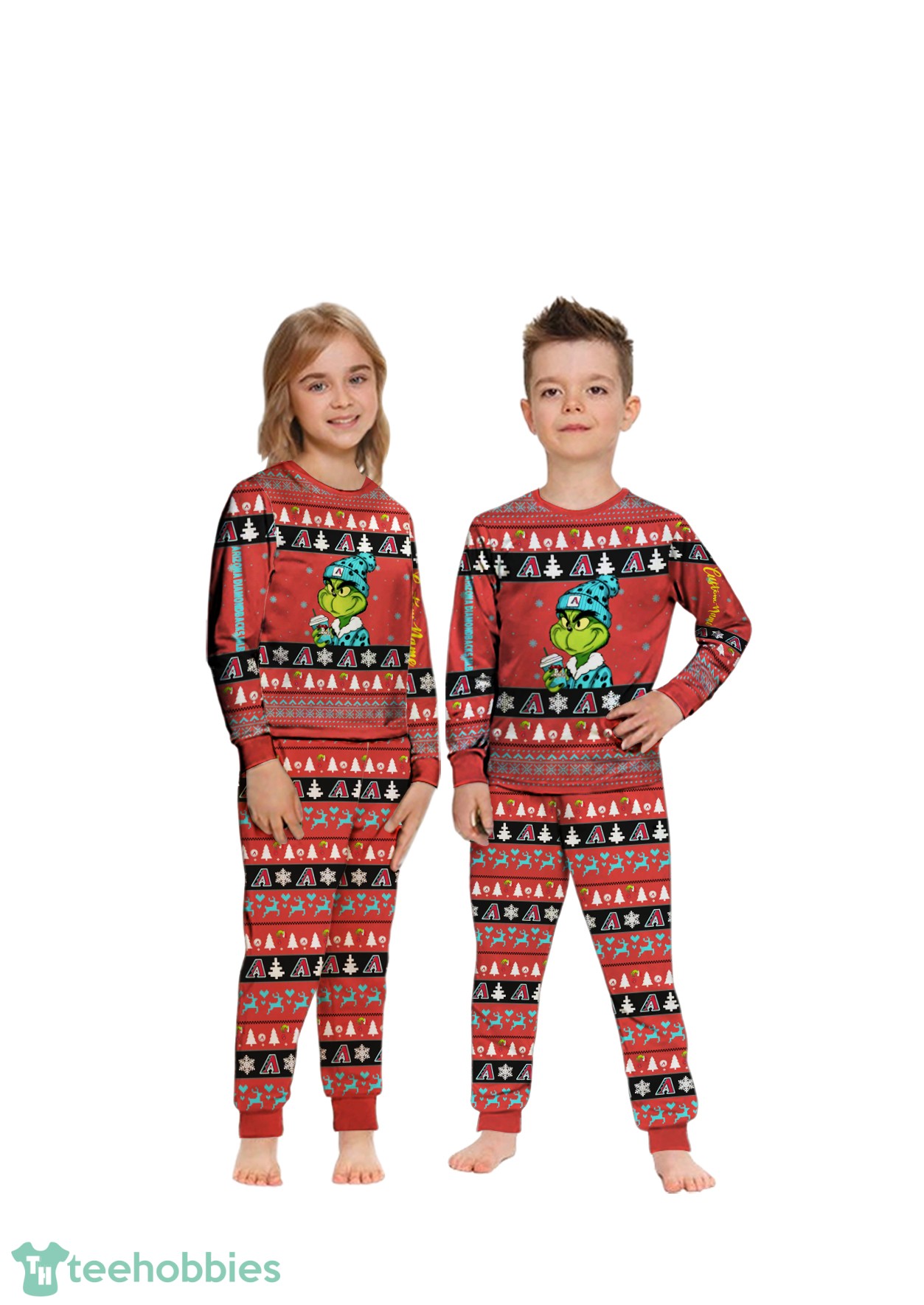 The design features a playful Grinch theme blended with the iconic colors and logos of the Arizona Diamondbacks. The overall pattern evokes a cozy, hand-knitted aesthetic, bringing warmth and charm to your holiday gatherings. The dominant colors are a vibrant mix of Diamondbacks red and teal, contrasted with the Grinch’s signature green, all designed to create a joyful and festive visual impact. The inclusion of custom names adds a personal touch, making these pajamas a cherished keepsake for years to come.