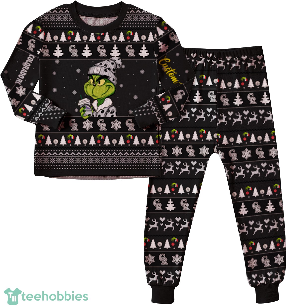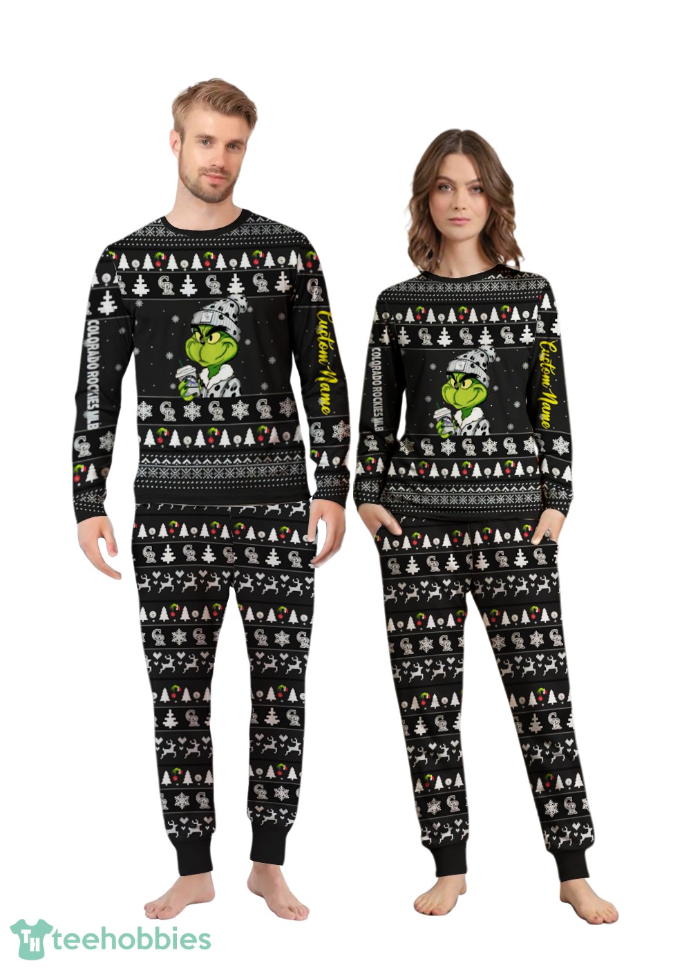 The pajamas feature a playful and festive design incorporating elements of the iconic Grinch character, the beloved Colorado Rockies MLB team, and a classic Christmas knitting pattern. The colors likely include vibrant greens, purples, and blacks, reflecting both the Grinch and Rockies team colors, interwoven with traditional Christmas reds and whites. The personalized name option adds a special touch, making each set unique and cherished. This composition blends team spirit, holiday fun, and personalized detail, making it a perfect gift or family tradition.