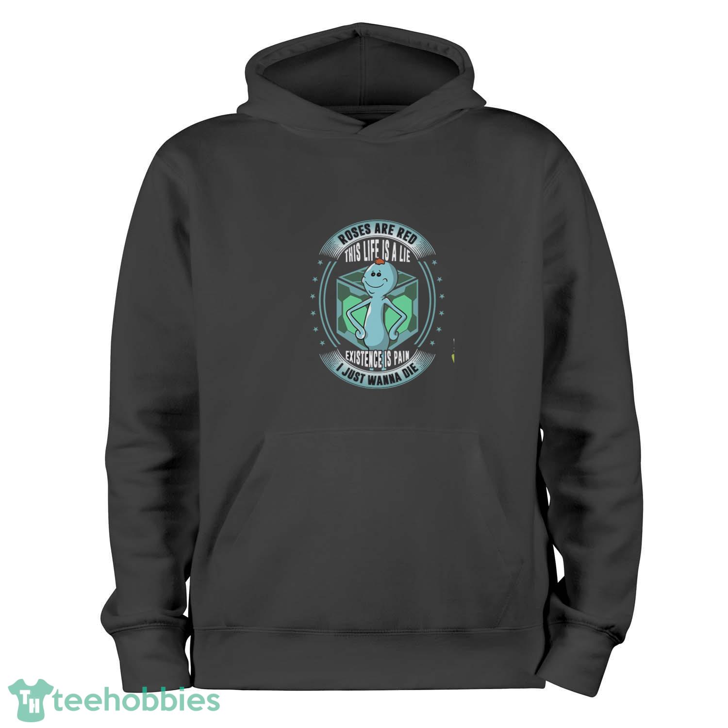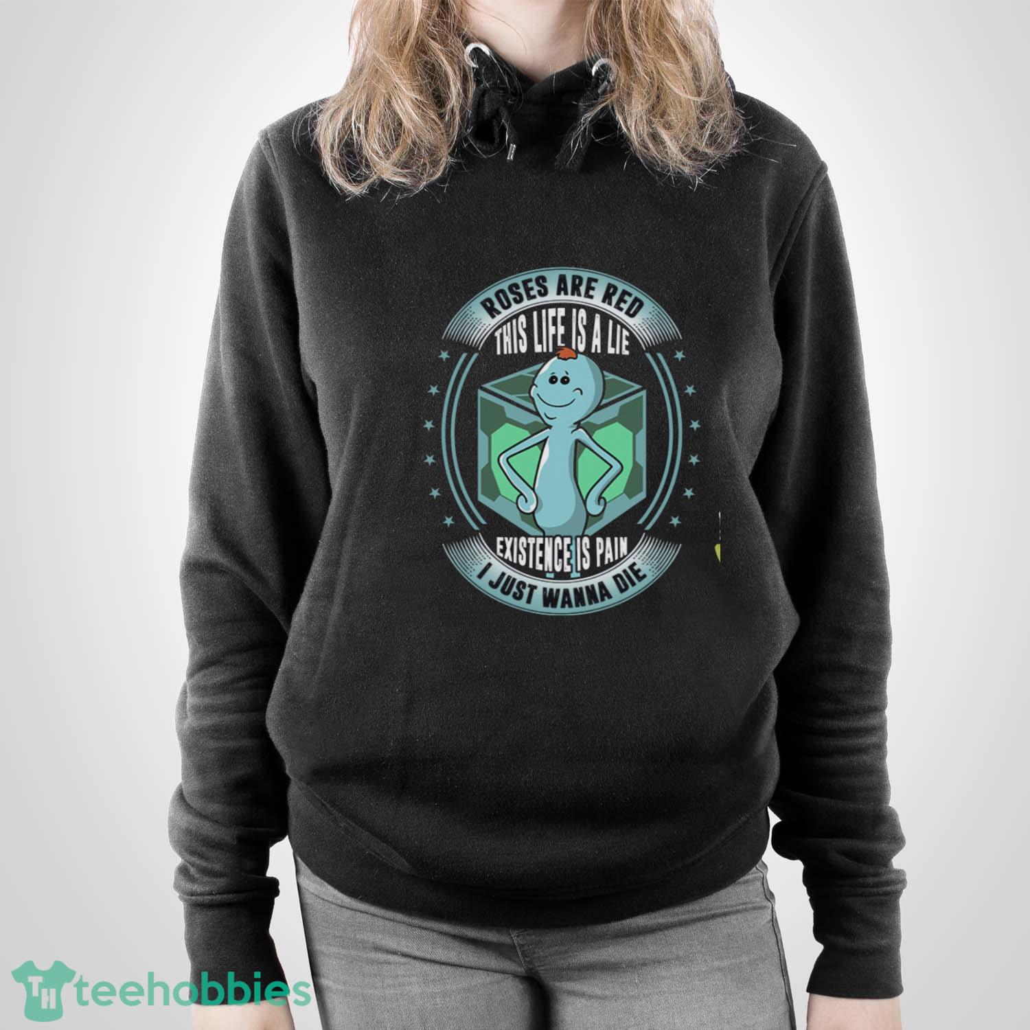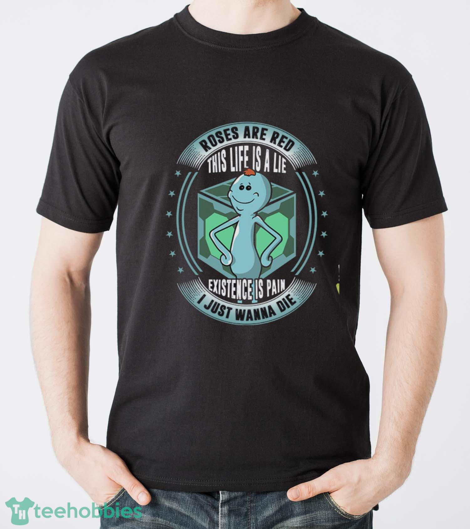 Mr. Meeseeks Roses Are Red This Life Is A Lie Existence Is Pain I Just Wanna Die T-Shirt Details
