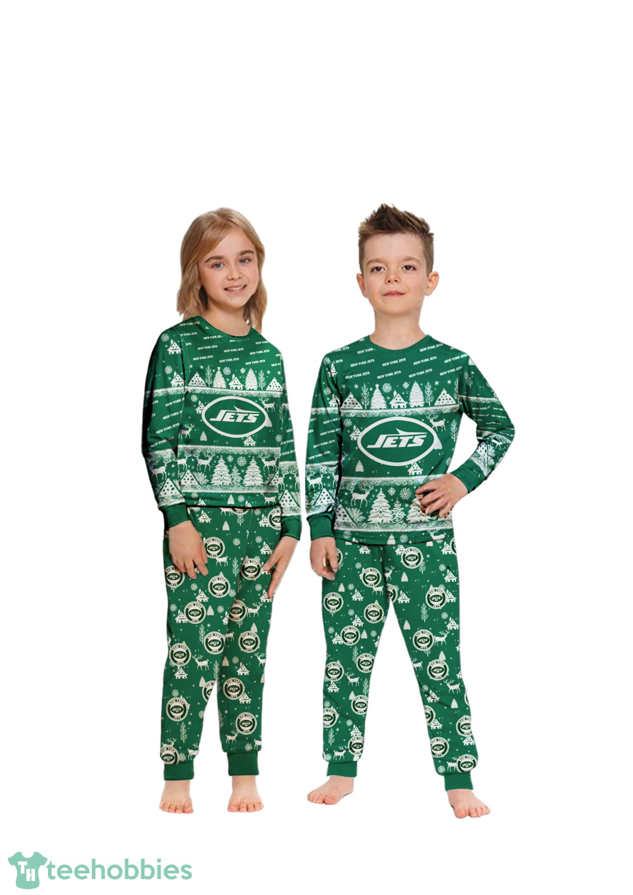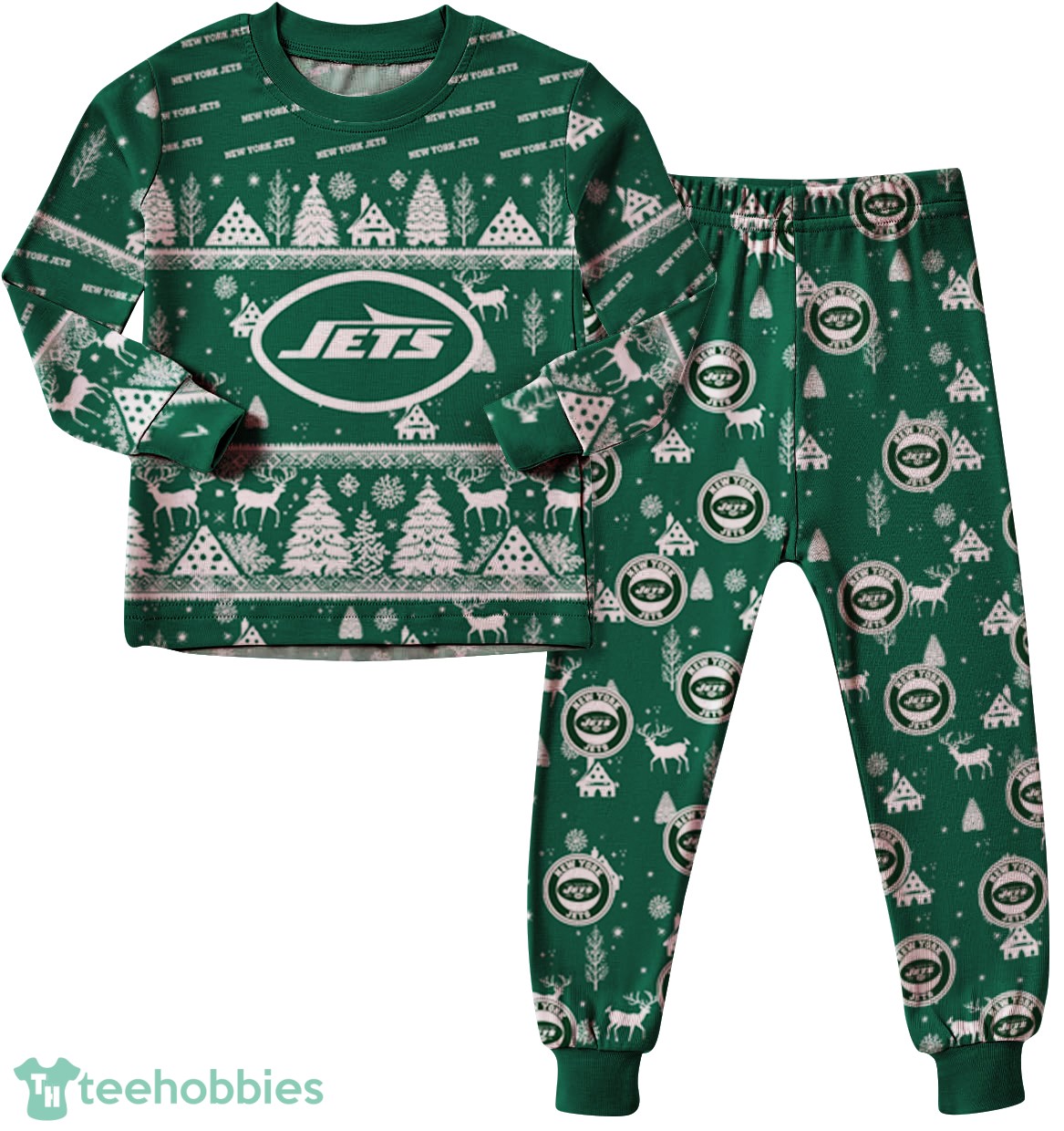 Inspired by the excitement of Christmas and the fervor of Jets fandom, these pajamas feature a unique design. The all-over print incorporates New York Jets team colors and logos with classic Christmas motifs, creating a festive yet sporty aesthetic. The design features snowflakes, Christmas trees and Jets logos in team colors of green, white and black.