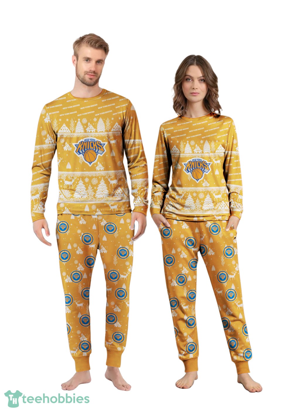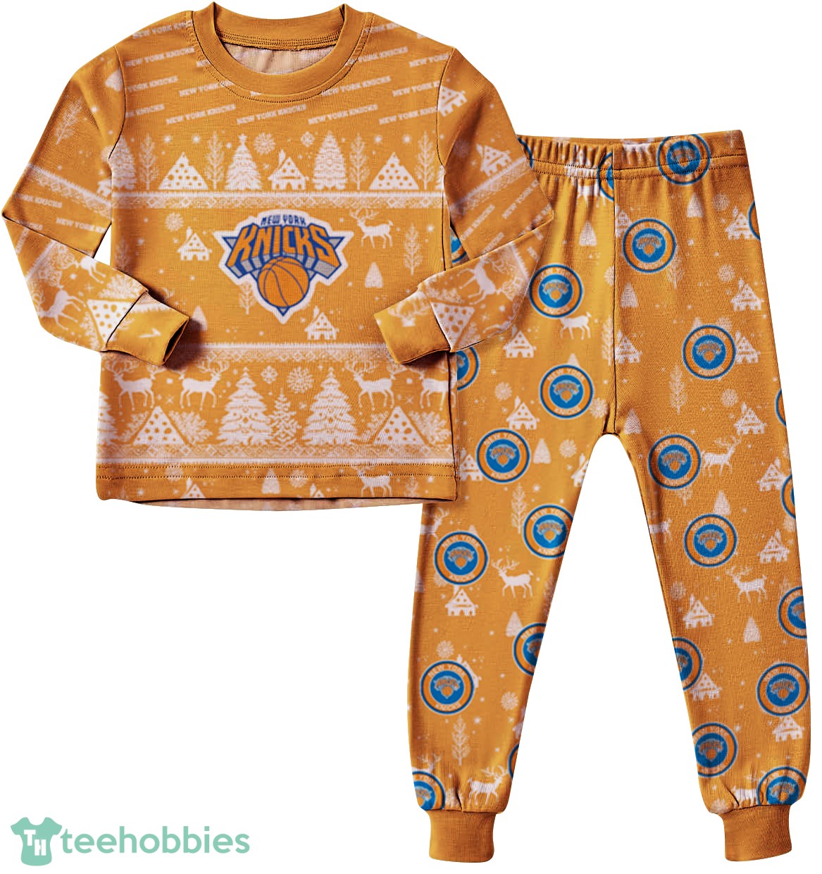 The design features a delightful Christmas pattern incorporating the iconic New York Knicks logo and colors – a vibrant blend of orange, blue, and white. Snowflakes, basketballs, and festive ornaments interweave seamlessly, creating a playful yet sophisticated holiday aesthetic. The composition is balanced, ensuring the pattern is eye-catching without being overwhelming, making these Christmas family pajamas a stylish choice for your holiday traditions.