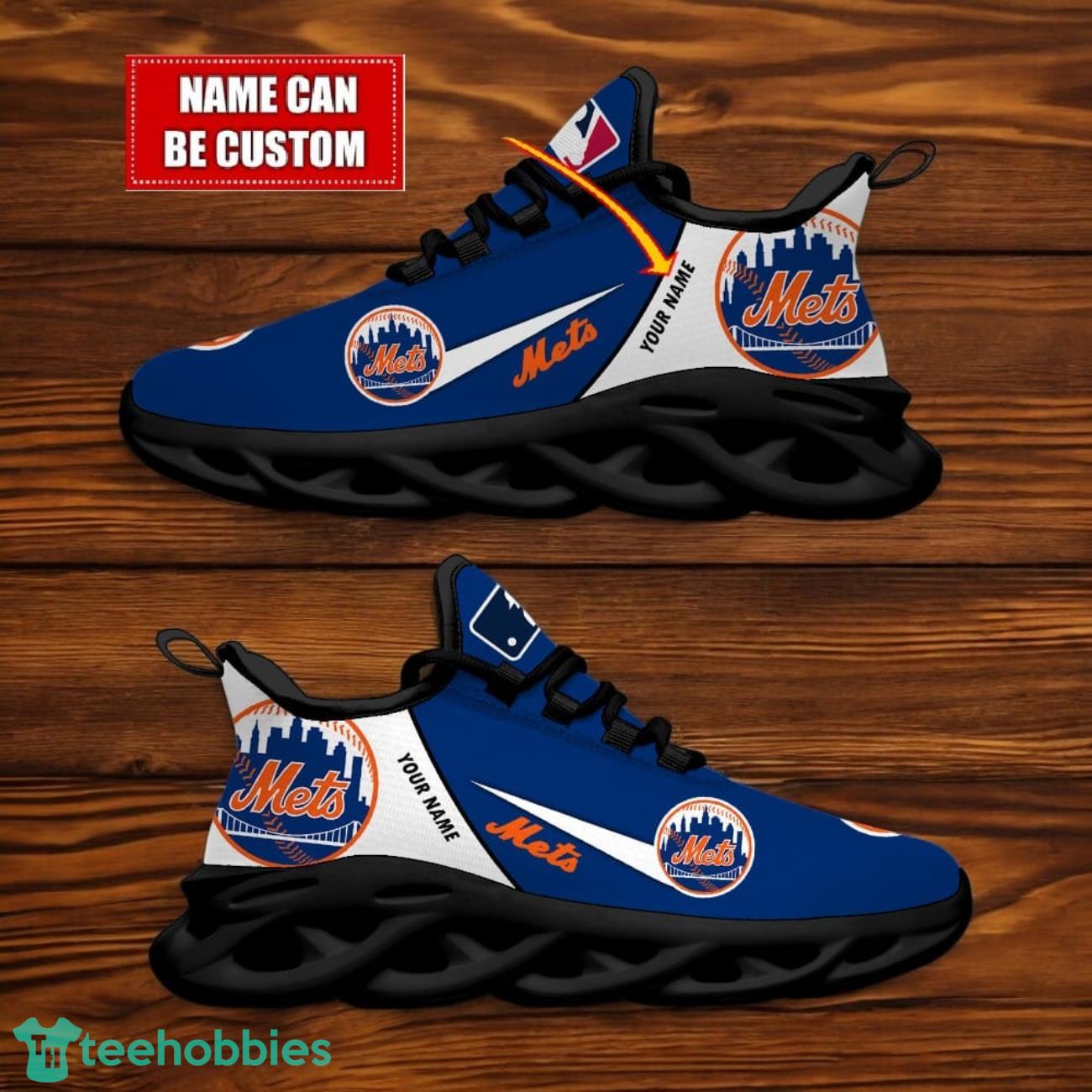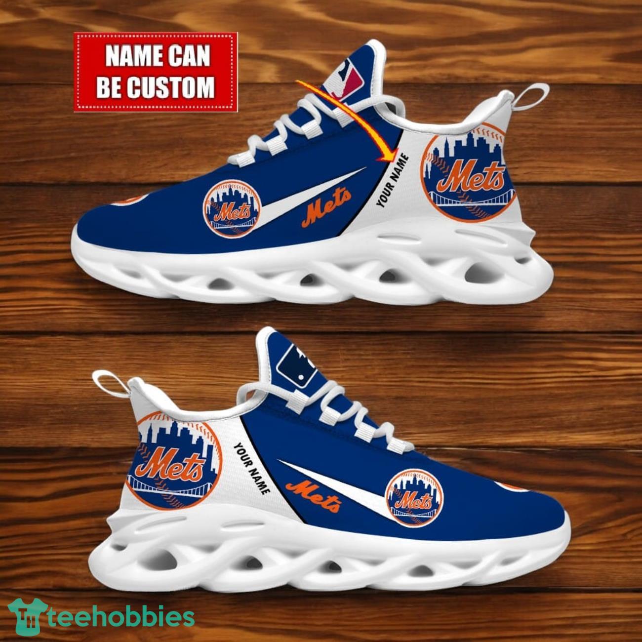 Show off your love for the New York Mets with these custom Team Logo Personalized Name MLB Max Soul Shoes! Made for both men and women, these sporty shoes are the perfect gift for any baseball fan. Stand out from the crowd with your own personalized touch on these stylish kicks. Whether you’re hitting the field or cheering from the stands, these shoes are sure to make a statement. Get your pair today and step up your game!
