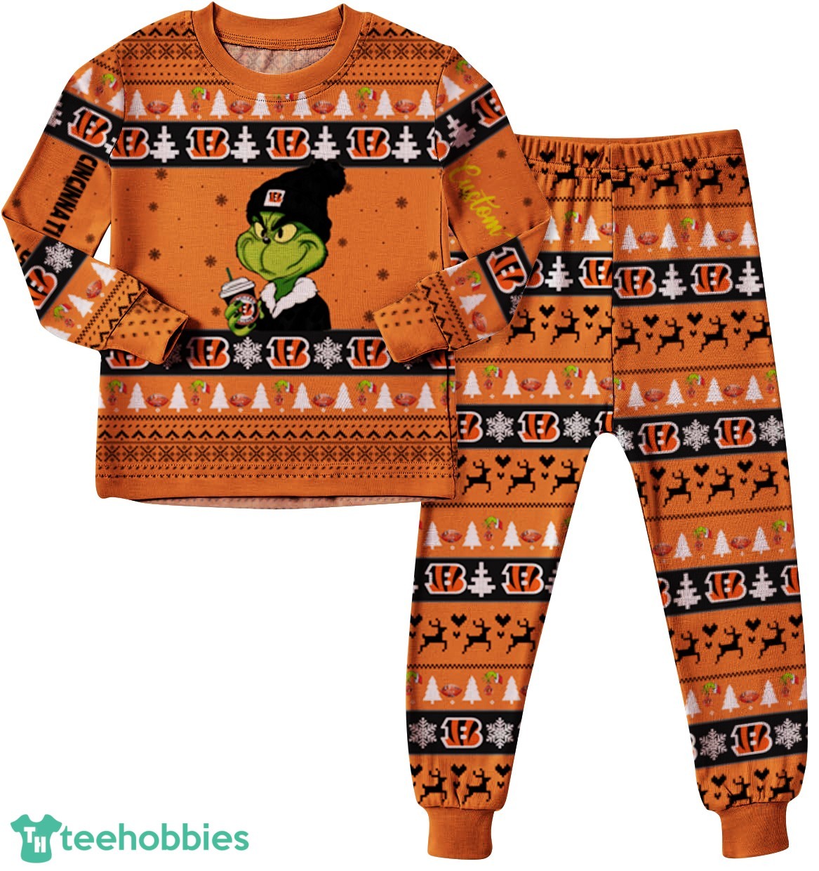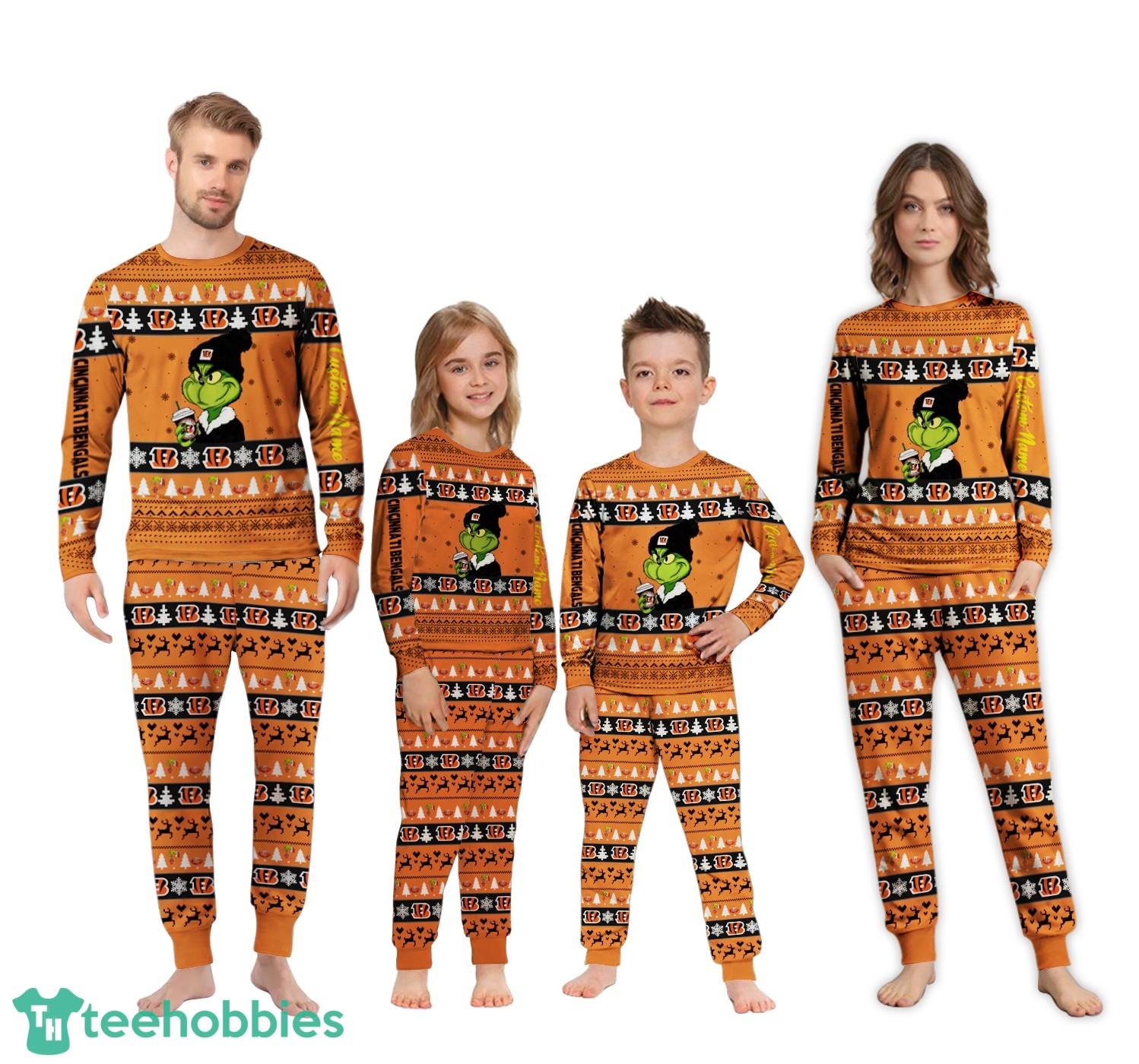 The pajamas feature a delightful Christmas knitting pattern infused with the iconic Grinch and the spirited Cincinnati Bengals theme. Imagine the whole family decked out in these unique and festive pajamas, showcasing your team pride and holiday cheer simultaneously. The design incorporates the Bengals’ colors and logo, seamlessly blending team spirit with the whimsy of the Grinch, making them truly special.