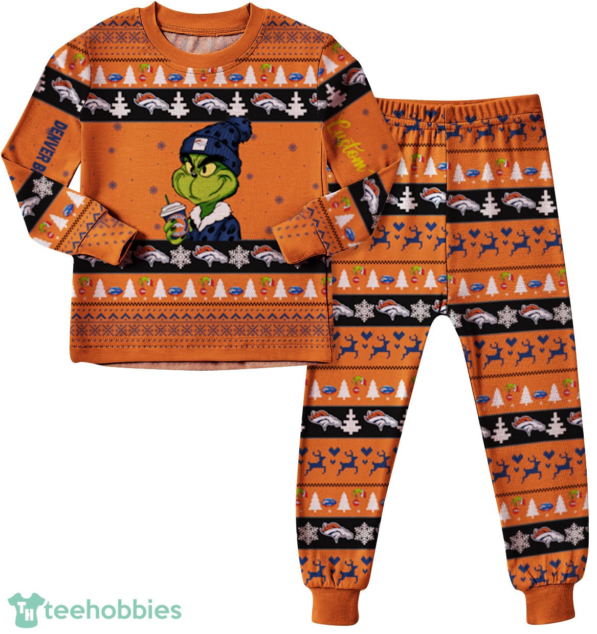 NFL Grinch Denver Broncos Custom Name Christmas Knitting Pattern Matching Family Pajamas Set