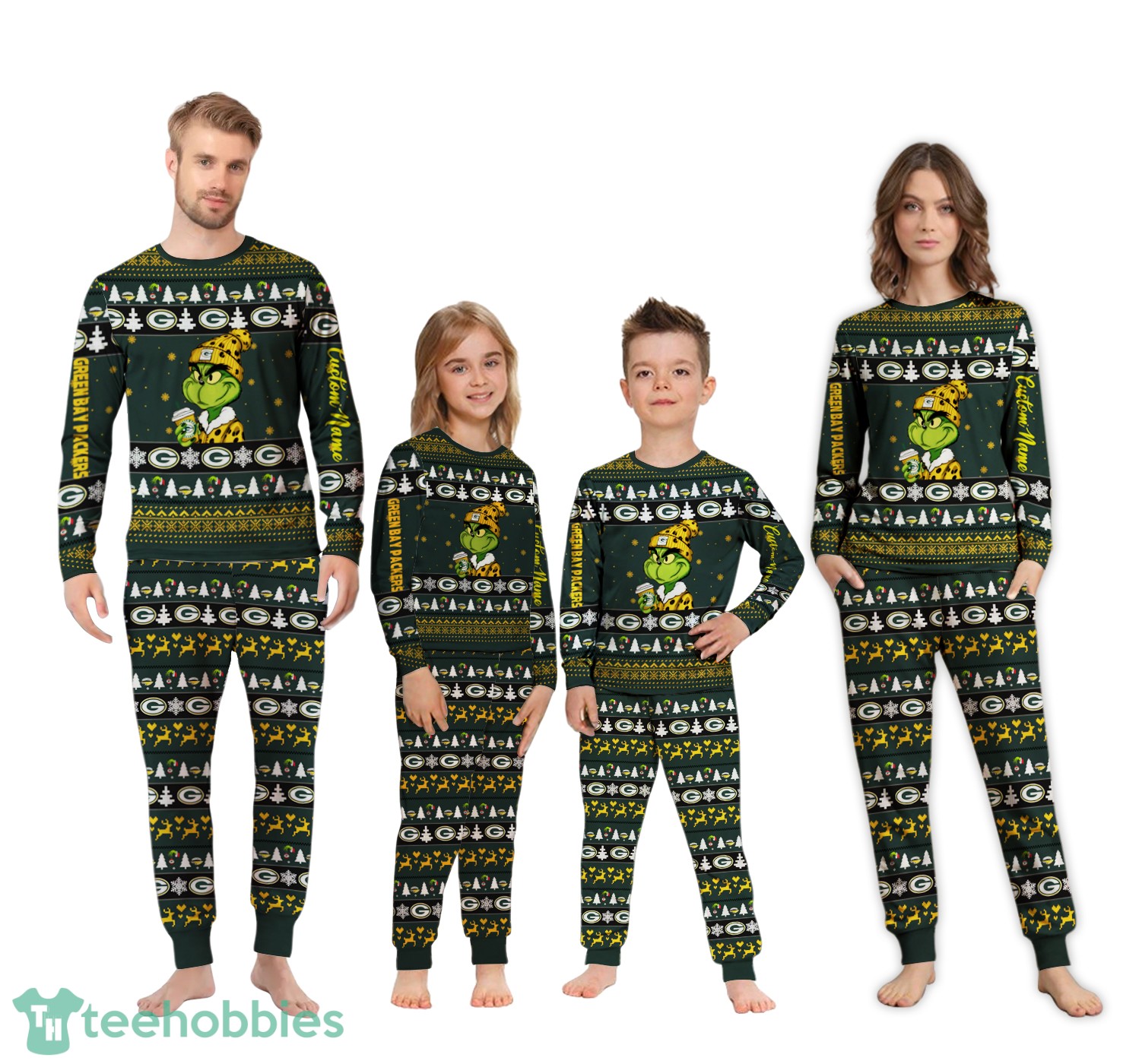 Embrace the Holiday Spirit with NFL Grinch Green Bay Packers Custom Name Christmas Knitting Pattern Matching Family Pajamas Set