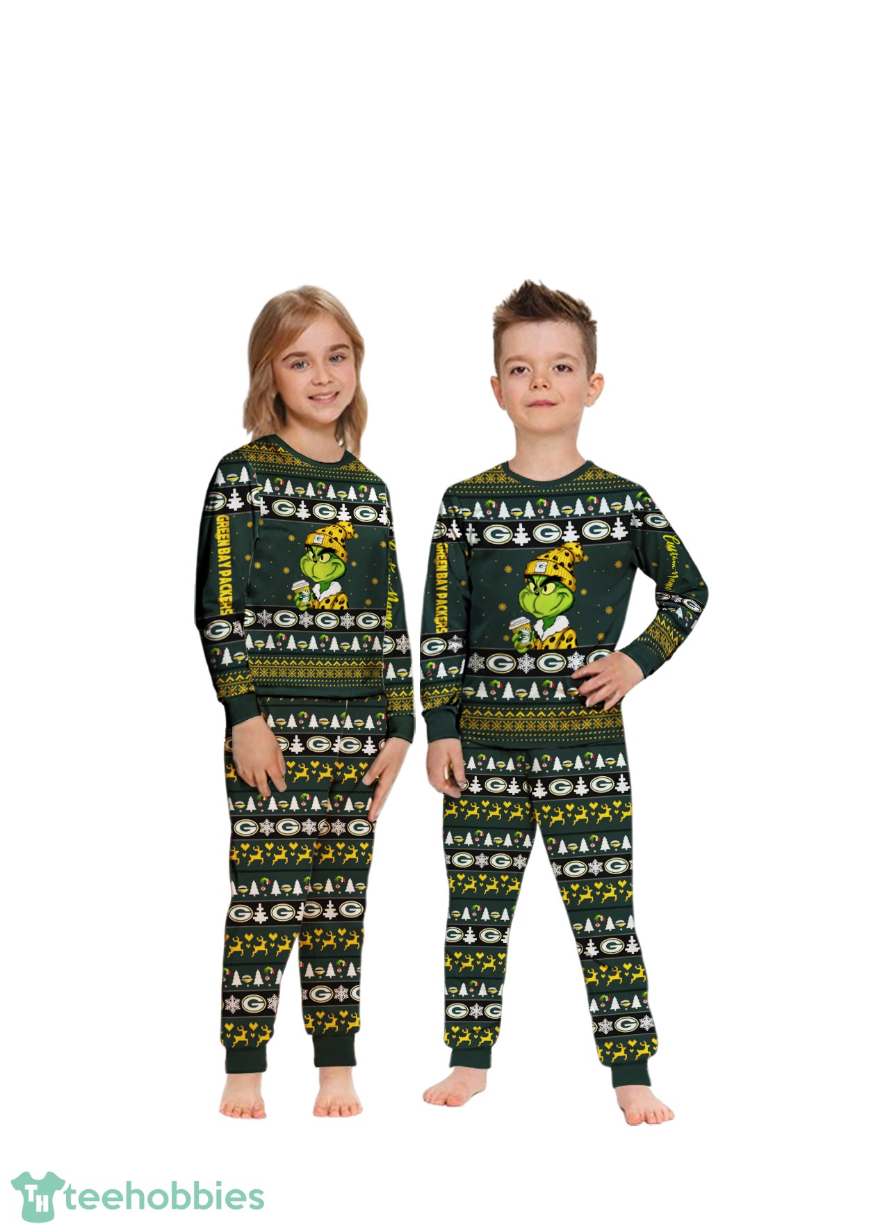 The design showcases a vibrant, festive palette dominated by the iconic Green Bay Packers green and gold, interwoven with classic Christmas colors like red and white. The playful Grinch motif adds a touch of mischievous holiday fun, making these pajamas visually appealing and perfect for the Christmas season. The custom name option adds a personal touch, making each set unique and special.