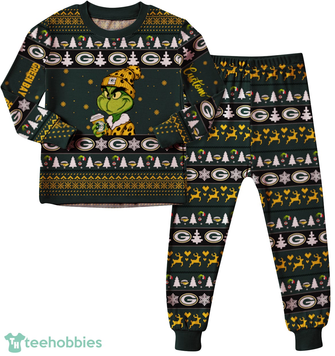 NFL Grinch Green Bay Packers Custom Name Christmas Knitting Pattern Matching Family Pajamas Set