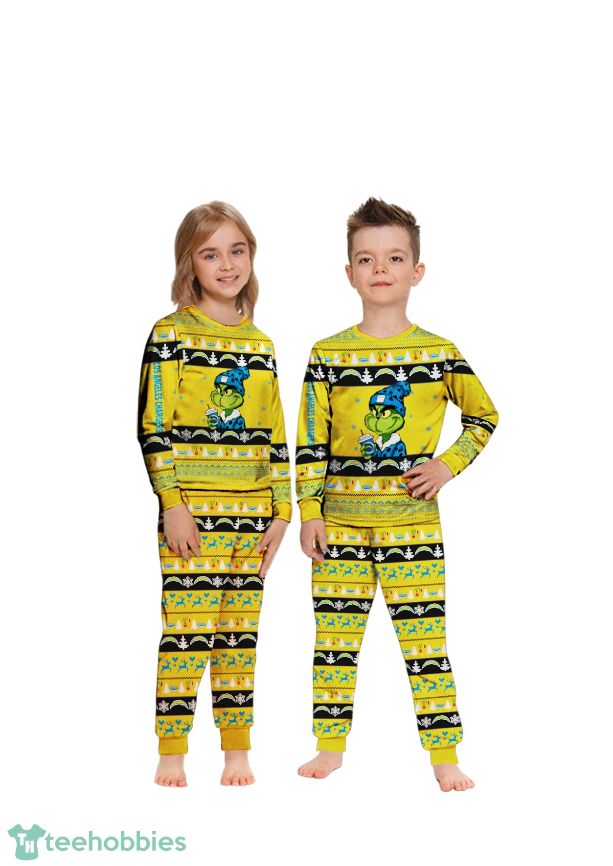 The pajamas showcase a vibrant design featuring the Los Angeles Chargers team colors and logos interwoven with a whimsical Grinch-inspired knitting pattern. The predominant colors are a cheerful blend of Chargers’ blue and gold, contrasted with Grinch’s signature green, creating a playful and festive aesthetic. The incorporation of custom names adds a personal touch, making each set a cherished keepsake. The composition is carefully balanced, ensuring that the team spirit and holiday cheer are equally represented.