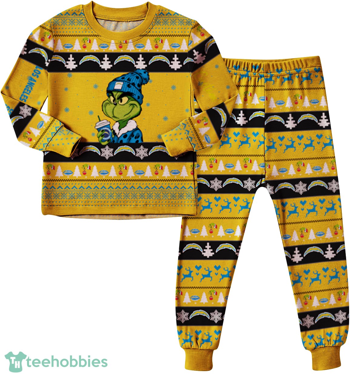 * All-Over Print: Features a vibrant and detailed all-over print design, ensuring that the Grinch and Chargers theme is prominent throughout the pajamas.