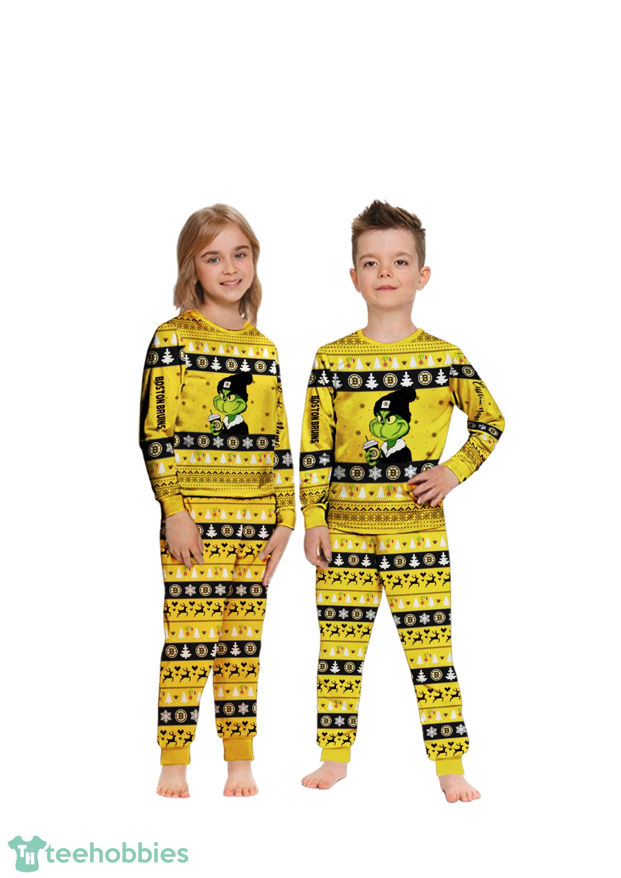The design features a festive knitting pattern, incorporating the iconic Boston Bruins colors and logo alongside Grinch-themed elements. The deep greens and touches of red evoke classic Christmas imagery, creating a cheerful and spirited look. The composition is balanced, with the team logo and personalized names seamlessly integrated into the overall pattern. This personalized Christmas pajamas set allows you to add a unique touch, making it a truly special keepsake for your family. Available for adults and kids (from 2Y to 10Y), these are ideal for creating those picture-perfect moments under the Christmas tree.