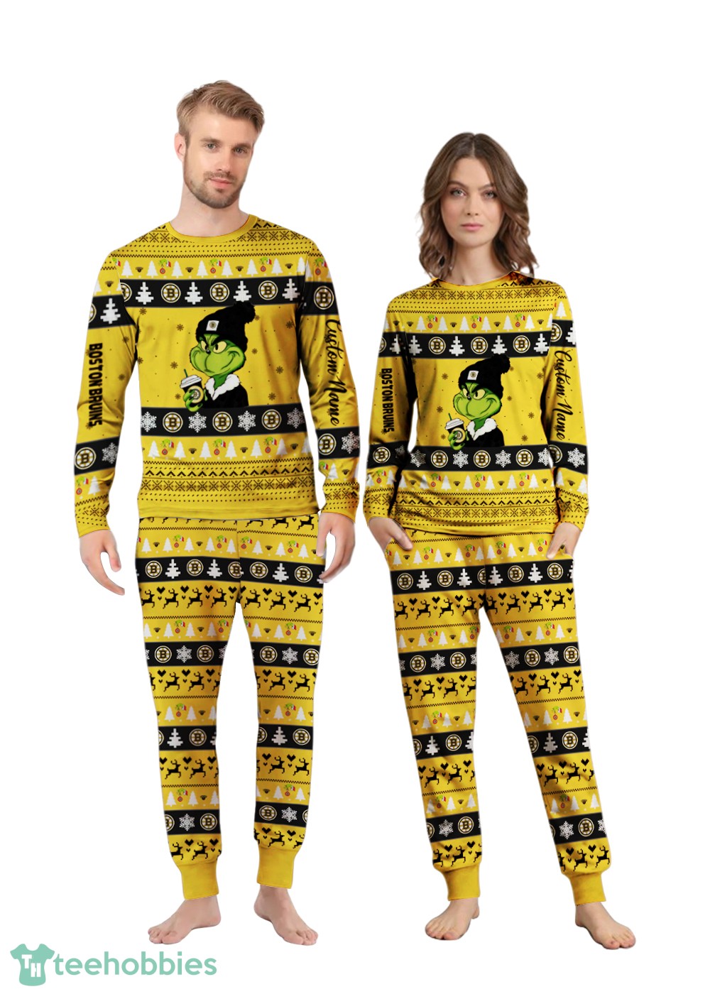 NHL Grinch Boston Bruins Custom Name Christmas Knitting Pattern Matching Family Pajamas Set