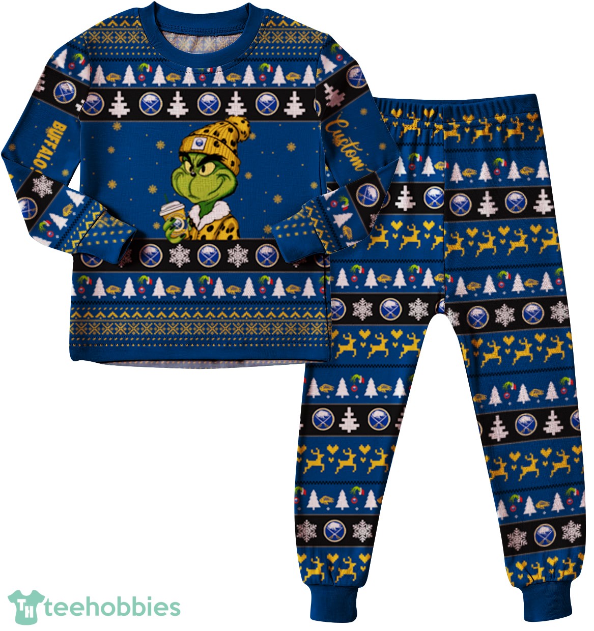 This holiday season, make it one to remember with the NHL Grinch Buffalo Sabres Custom Name Christmas Knitting Pattern Matching Family Pajamas Set.