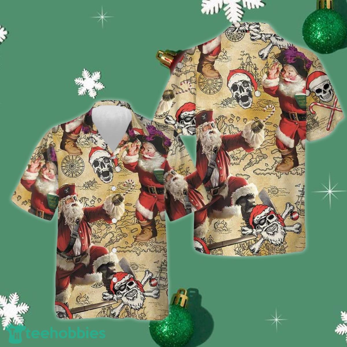 Designed specifically for Christmas, this Hawaiian shirt features a hilarious twist on the traditional Santa Claus outfit. With a fun pirate-inspired design, Santa Claus is transformed into a swashbuckling captain, complete with a Santa hat adorned with a skull and crossbones.