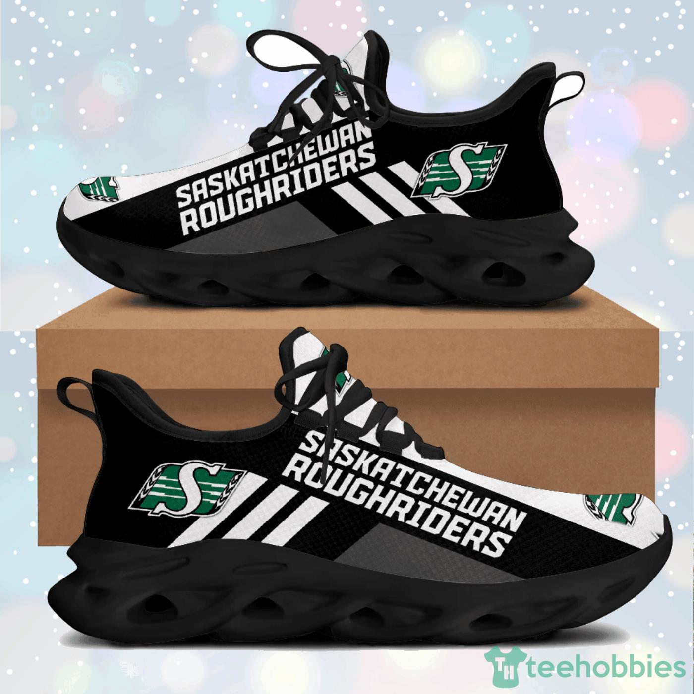 This Saskatchewan Roughriders White Striped Max Soul Sneaker Running Shoes is a breathable, lightweight, and comfortable casual outdoor shoe that has a unique design. It is made of a mesh fabric which makes it sweat absorbent and breathable, while the rubber bottom ensures traction, comfort, and durability. It is available in two colors: black or white sole. There are two styles of shoelace holes so you can choose your preference.