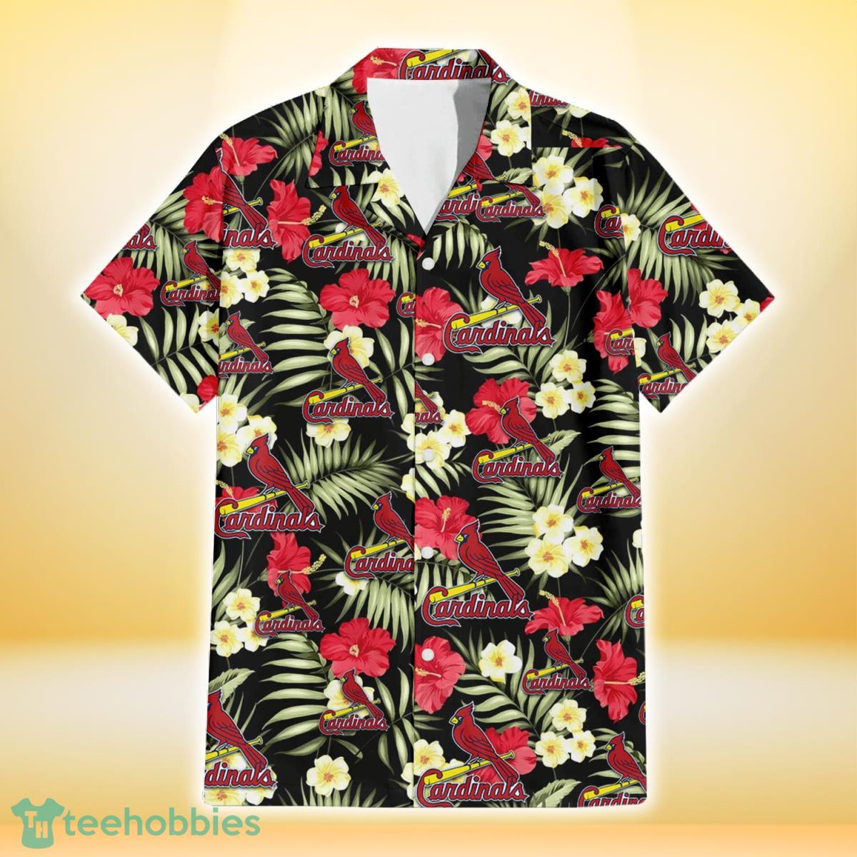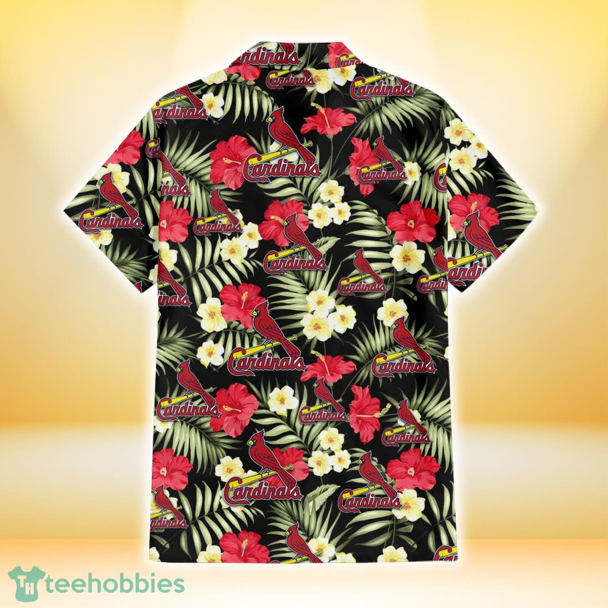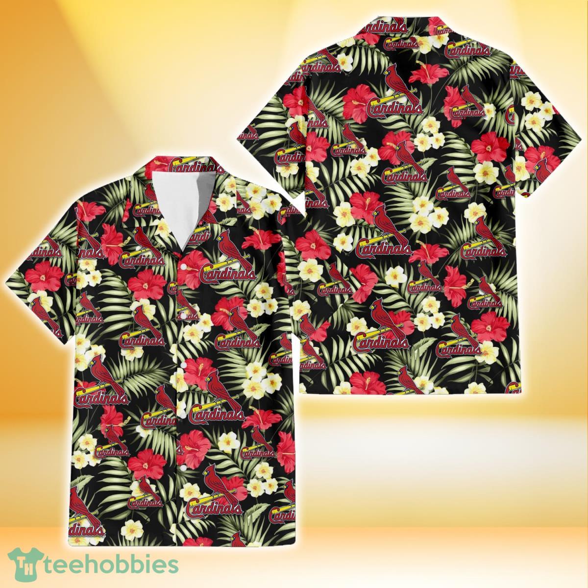 Some of the St. Louis Cardinals Red Hibiscus Yellow Porcelain Flower Black Background 3D Hawaiian Shirt Gift For Fans photos