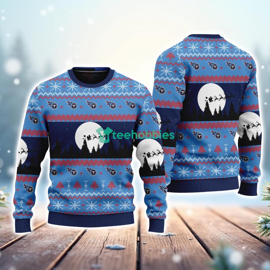 The design features a festive blend of Christmas iconography alongside bold Titans imagery. The color palette likely incorporates the team’s signature navy blue, light blue, and silver, creating a visually appealing and spirited holiday garment. It is a cozy and celebratory way to display your fandom.