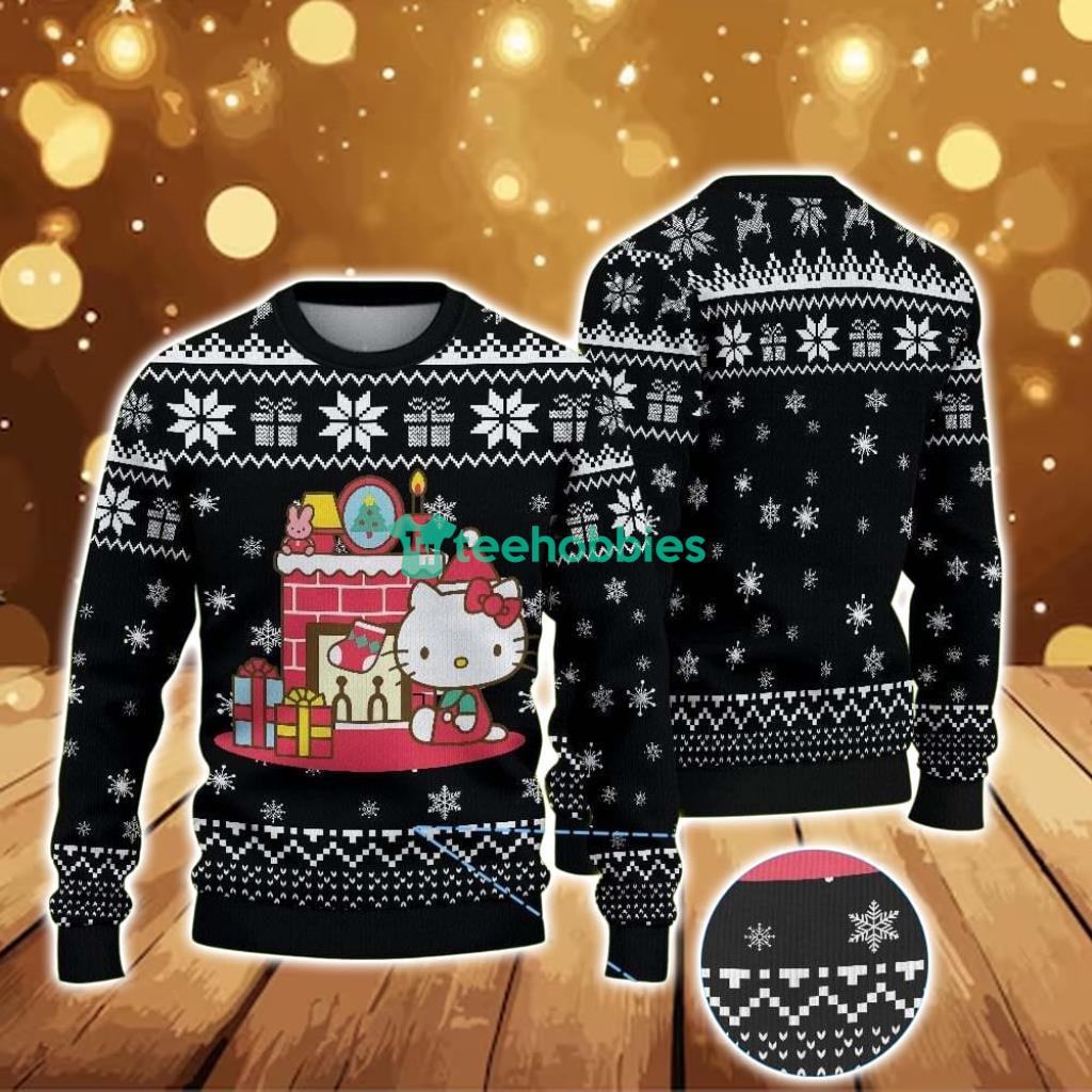 Ugly Christmas Sweater With Snowflake And Gift Pattern Featuring Hello Kitty By The Fireplace