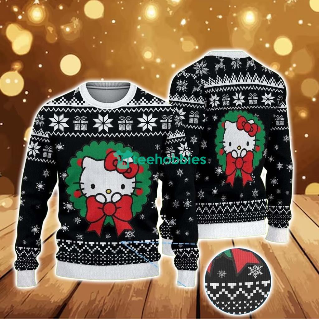 Ugly Christmas Sweater With Snowflake And Gift Pattern Featuring Hello Kitty In Christmas Wreath