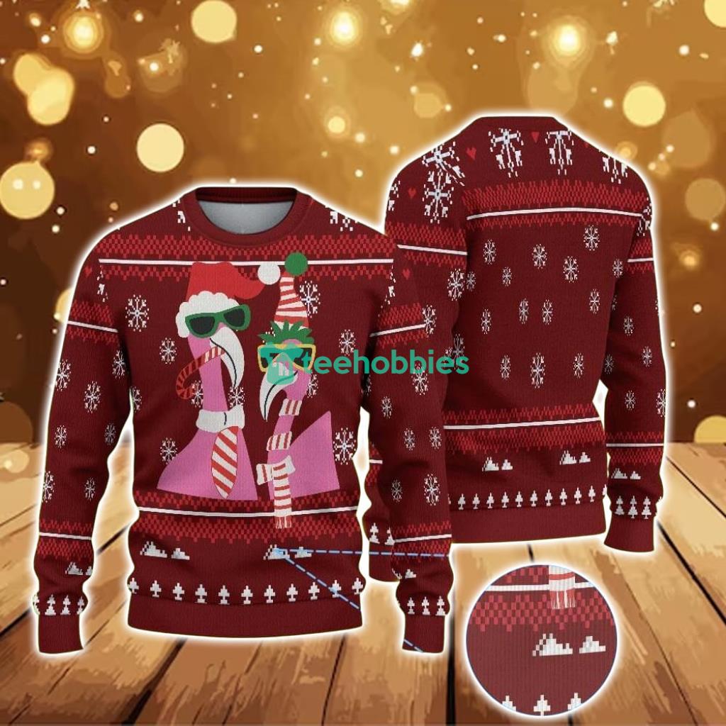 Ugly Christmas Sweater With Snowflake And Tree Pattern Featuring Cool Pink Flamingos In Santa Hats