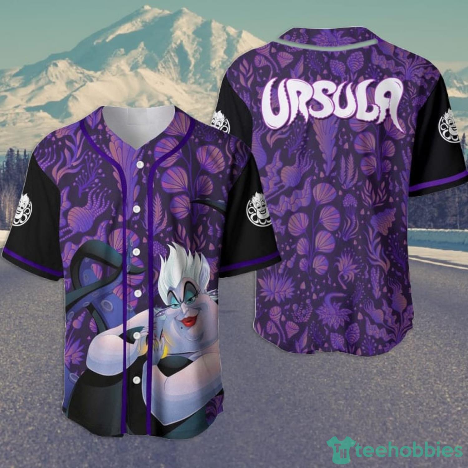 This Ursula pattern baseball jersey shirt is perfect for any Little Mermaid lover! It features an all-over print of Ursula the Sea Witch in her iconic purple outfit. The shirt is made of a soft and comfortable fabric, and the dark purple color is perfect for any Little Mermaid fan.