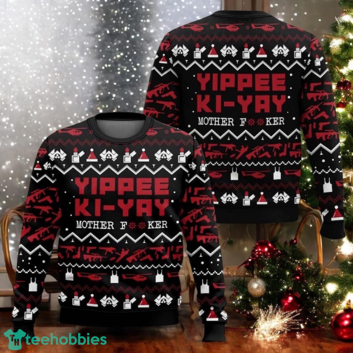 The design incorporates the phrase “Yippee Ki Yay,” a recognizable line from the movie, blending it seamlessly with traditional Christmas sweater elements. The color palette utilizes classic holiday hues like red, green, and white, possibly incorporating snowflakes, reindeer, or other seasonal motifs. The overall composition likely balances the action-movie reference with the whimsical, often intentionally tacky, aesthetic of ugly Christmas sweaters, creating a humorous and eye-catching garment.