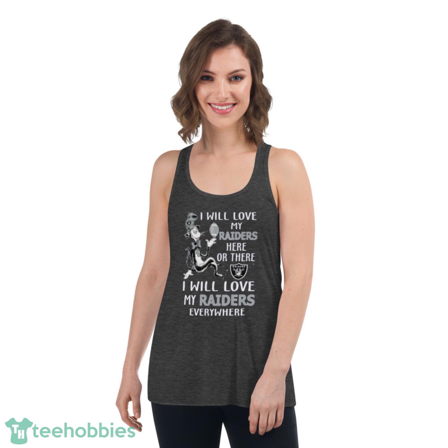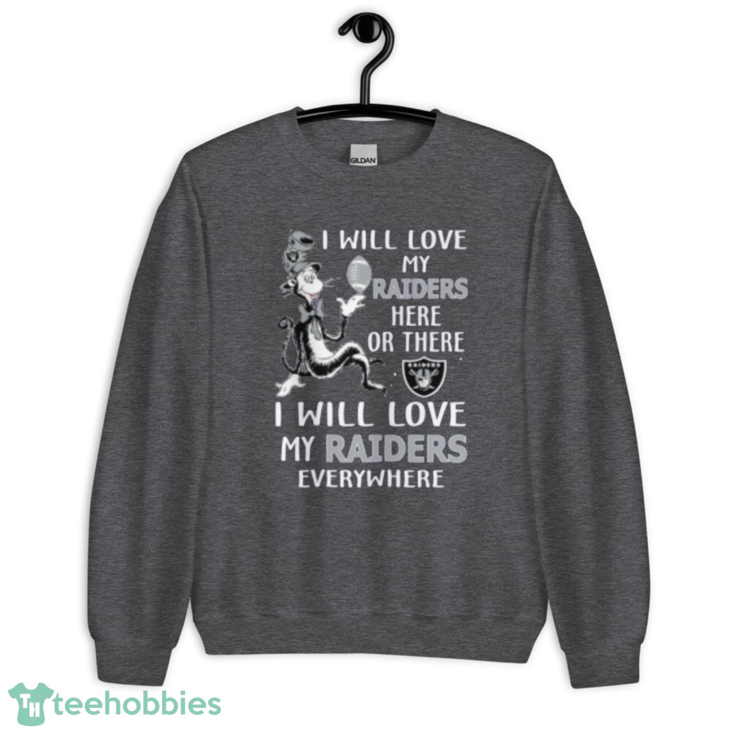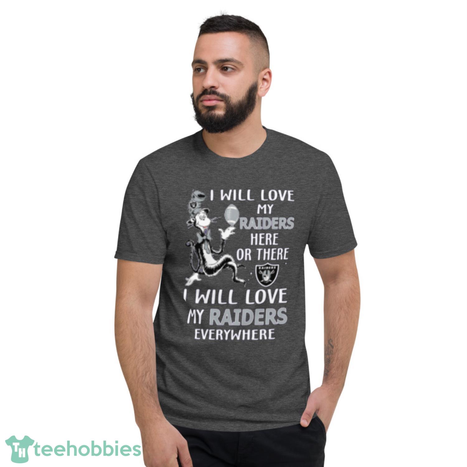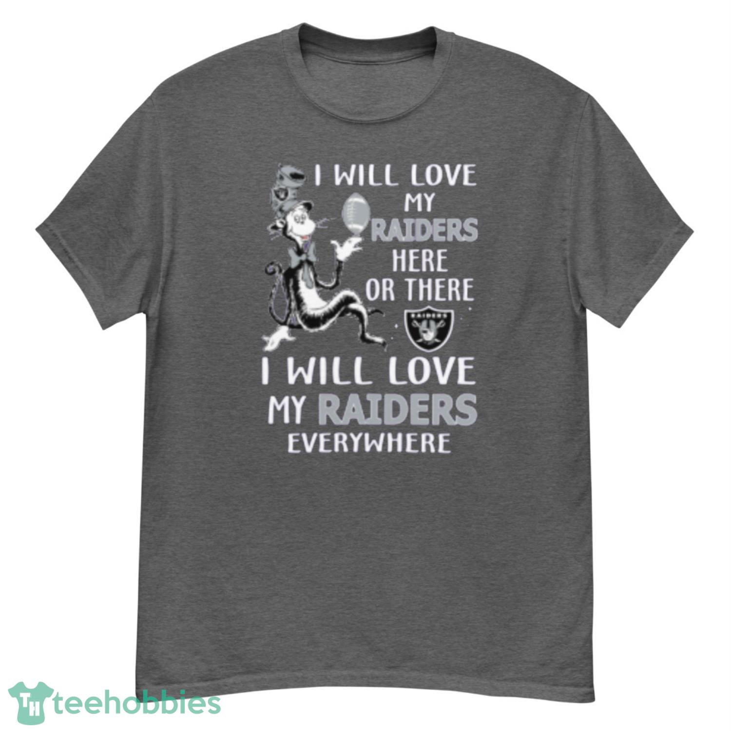 The front of the shirt features a fantastic design showcasing your love for the Raiders. The message “I will love my Raiders everywhere” is displayed in bold letters, making a statement that cannot be ignored. The design also features a Dr. Seuss-inspired font, adding a fun and playful touch to the t-shirt.